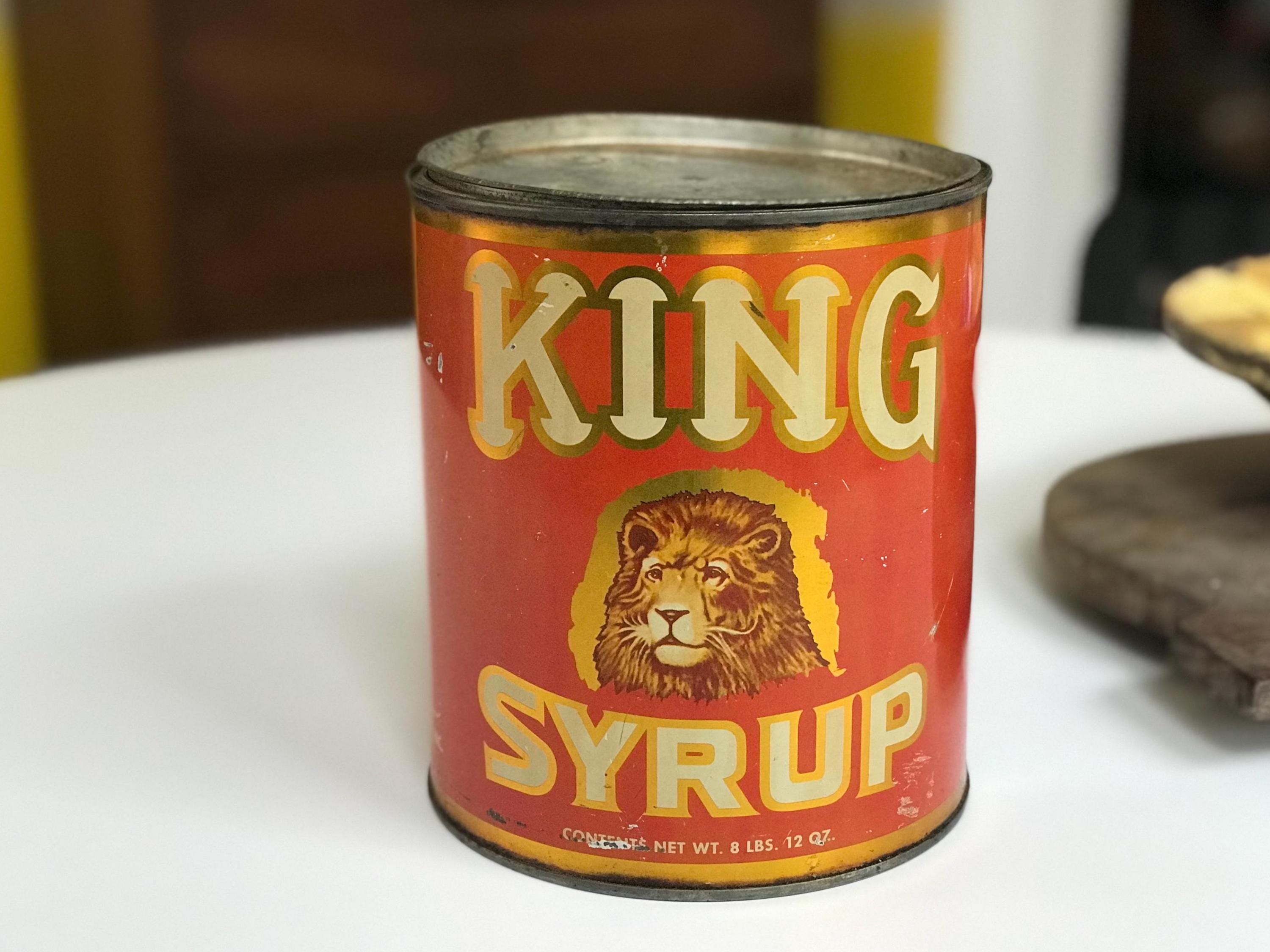 A Baltimore based company, King Syrup, originally a Danish brand started in 1915. This is likely a 1940s can, with a litho printed exterior in red and white, sporting the classic King Syrup lion, while utilizing the gold tones of the can. In excellent condition for its age with some minor wear and tear. The inside of the can is in pristine condition and the lid as well—a great can for keeping your food fresh and your kitchen aesthetically pleasing.