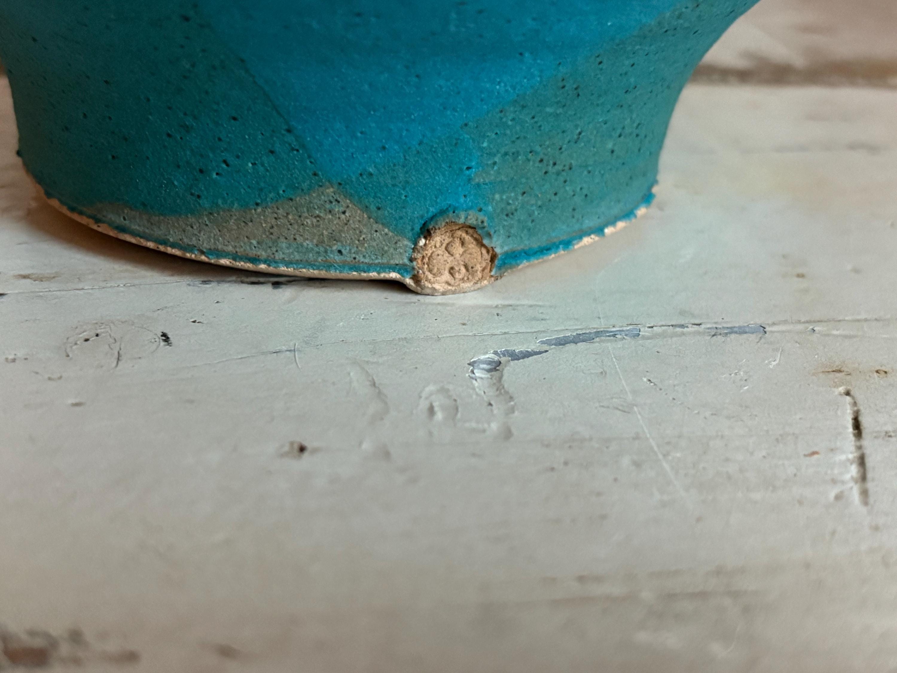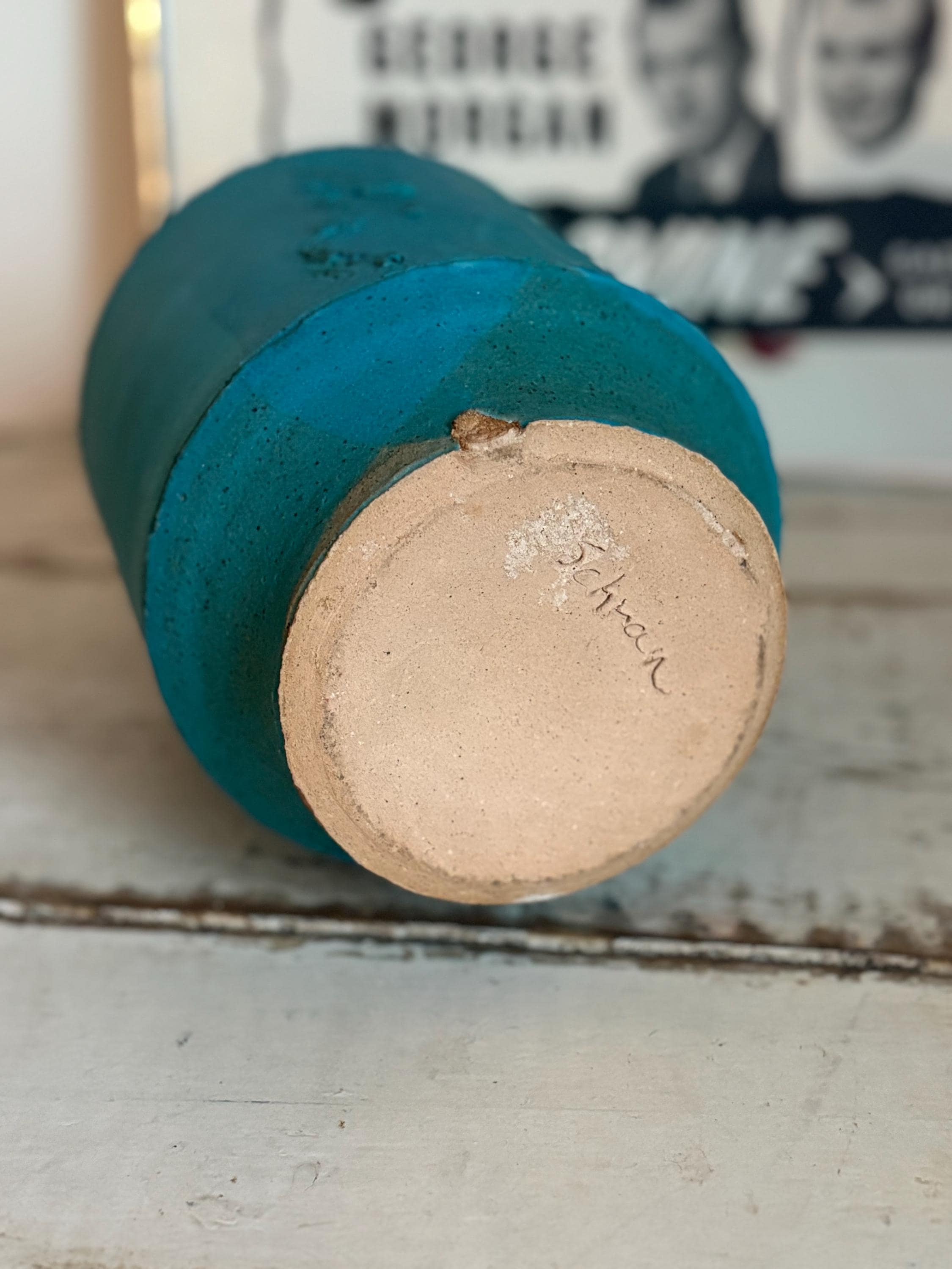This is an antique 1960s modern turquoise stoneware vase, signed and stamped and in pristine condition. The signature reads “Schran” and the stamp appears to be a “CS”. There may be a third letter but we are unable to identify it. Very Japanese modern in style. The glaze is matte and in a bright turquoise that photos just could never capture! A stunning piece for the collector or mcm home. Stands about 9.25” tall.