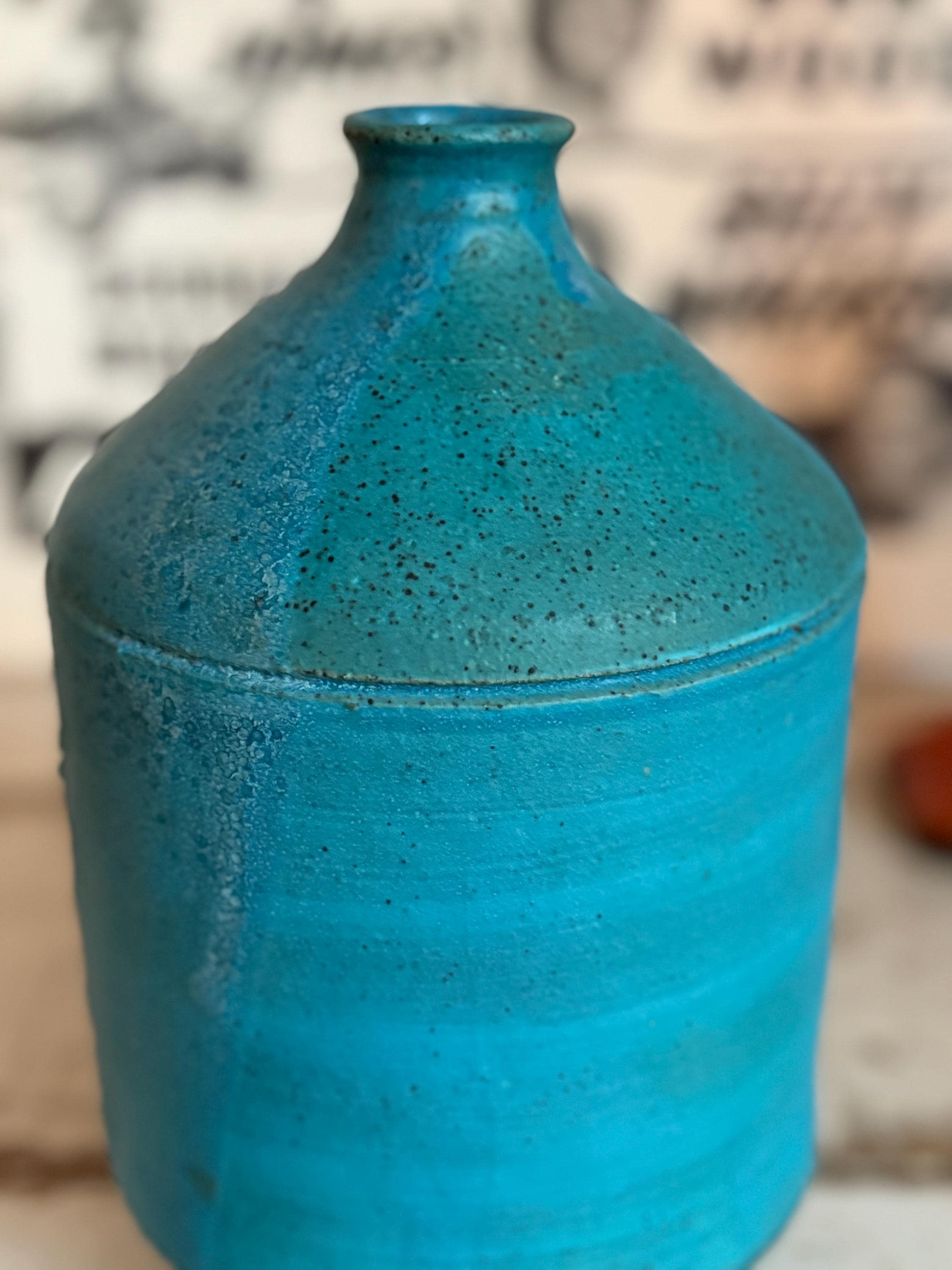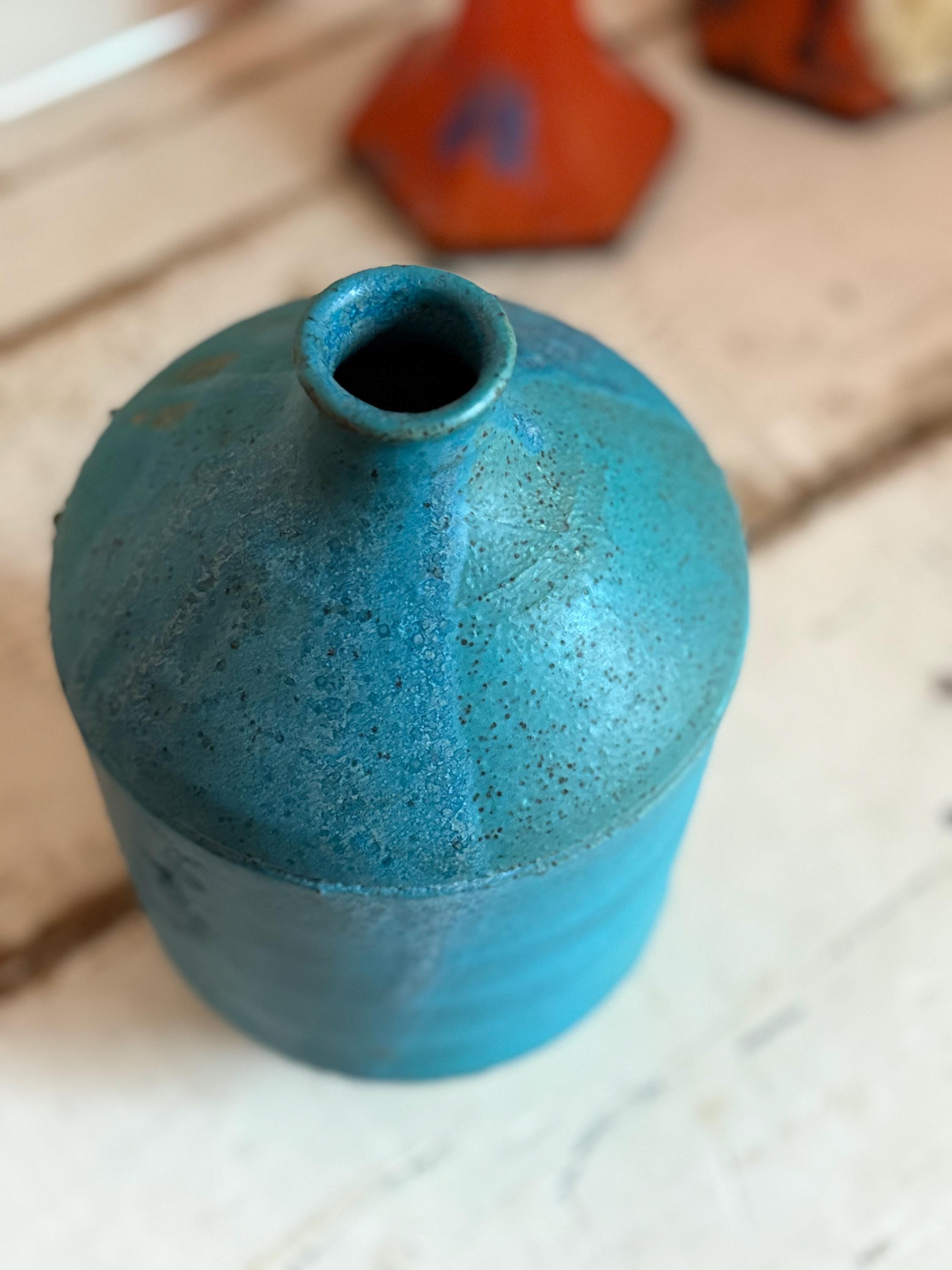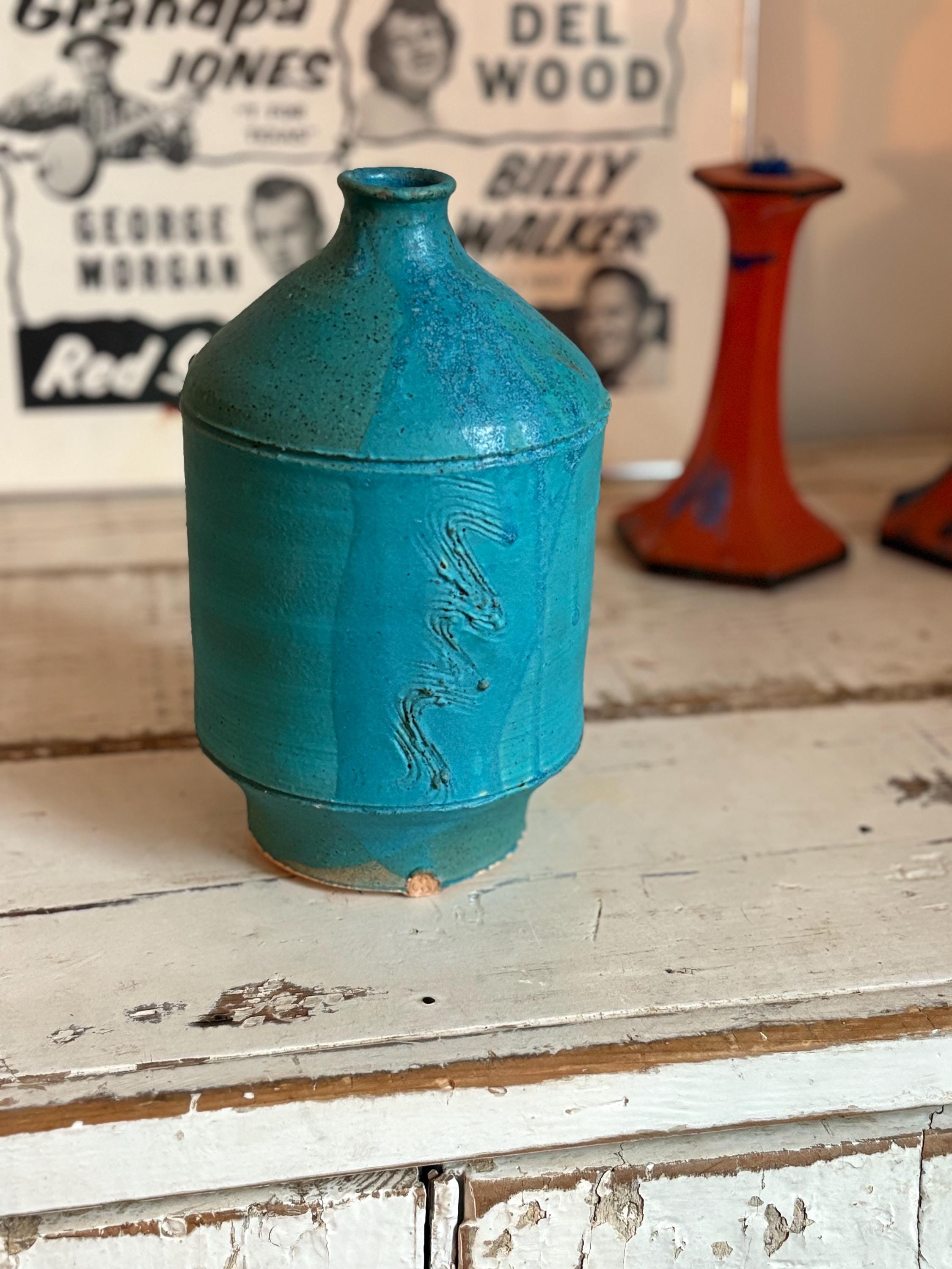 1960s Turquoise Matte Stoneware Vase 9.25”, Signed