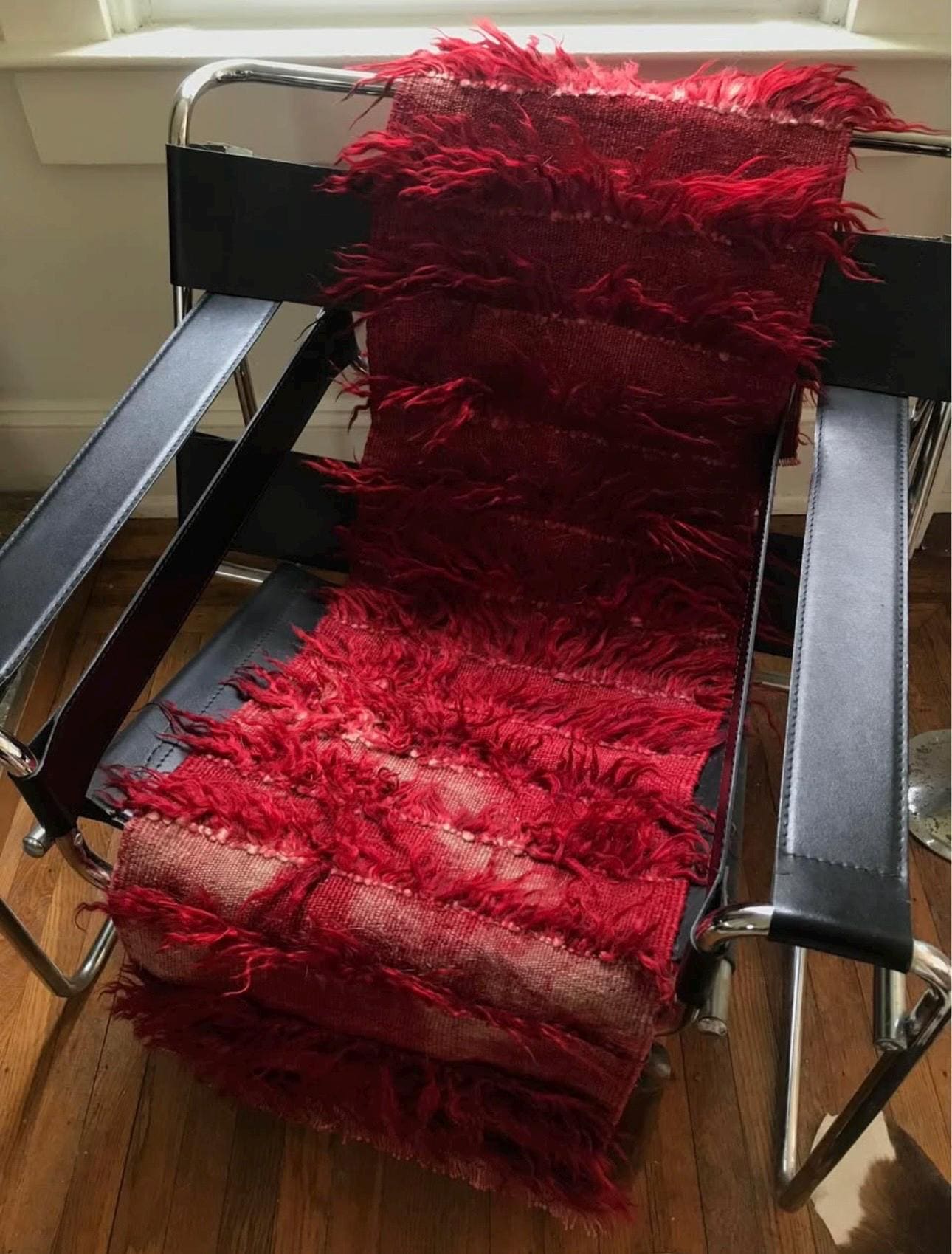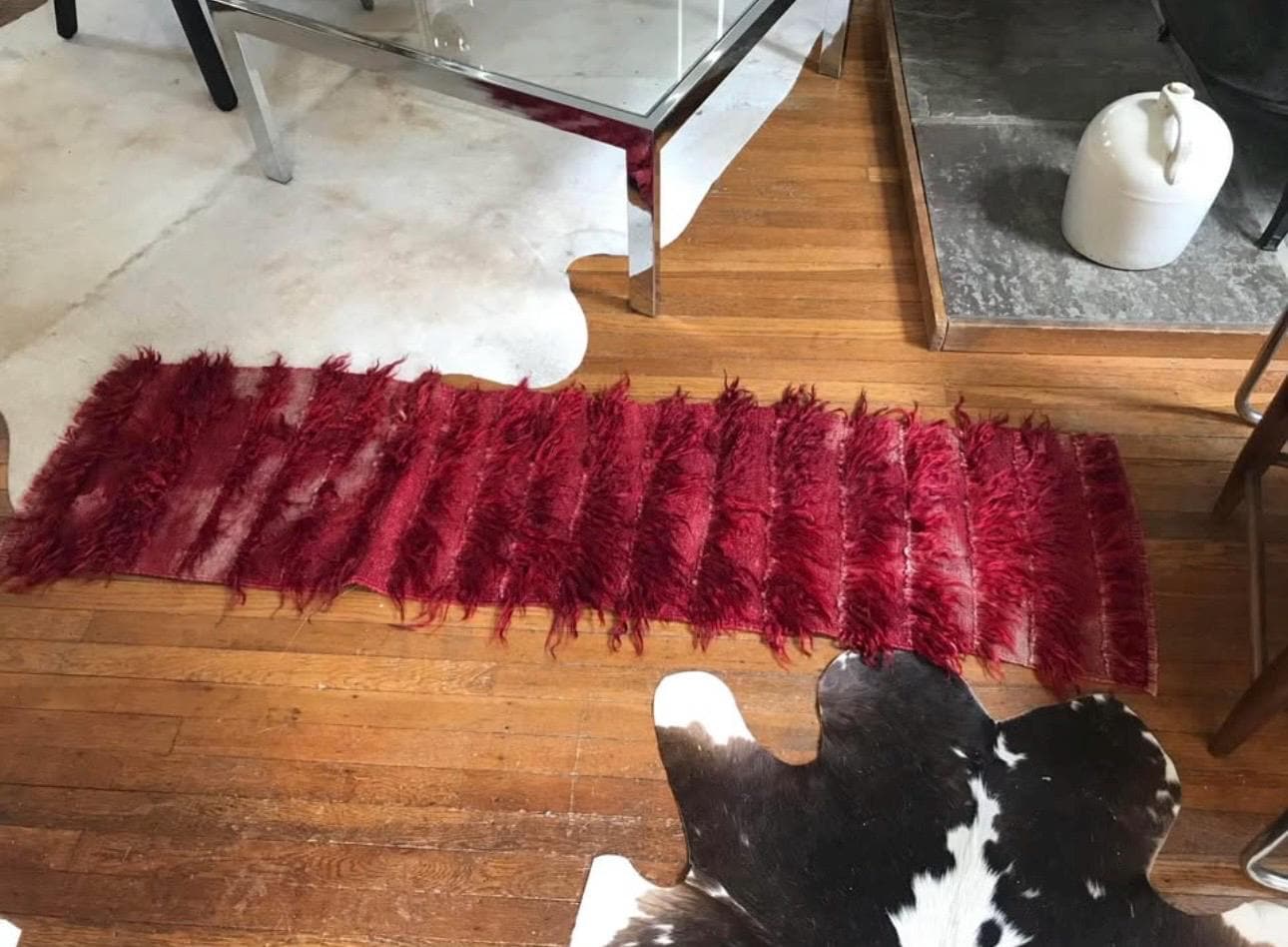 Beautiful deep red runner rug with red wool tufts. A great accent rug or for a petite hallway or bathroom. It’s in great shape, no damages however it does come from a home with pets and has been vacuumed but could use a dry clean. Or we can have it dry cleaned before shipping, just get in touch. Handmade with wool. Circa 1960s.