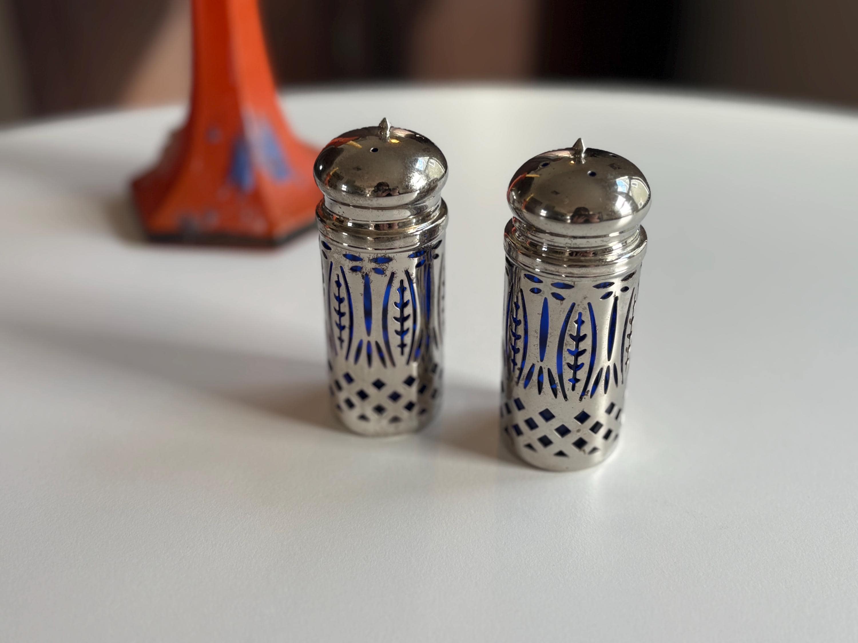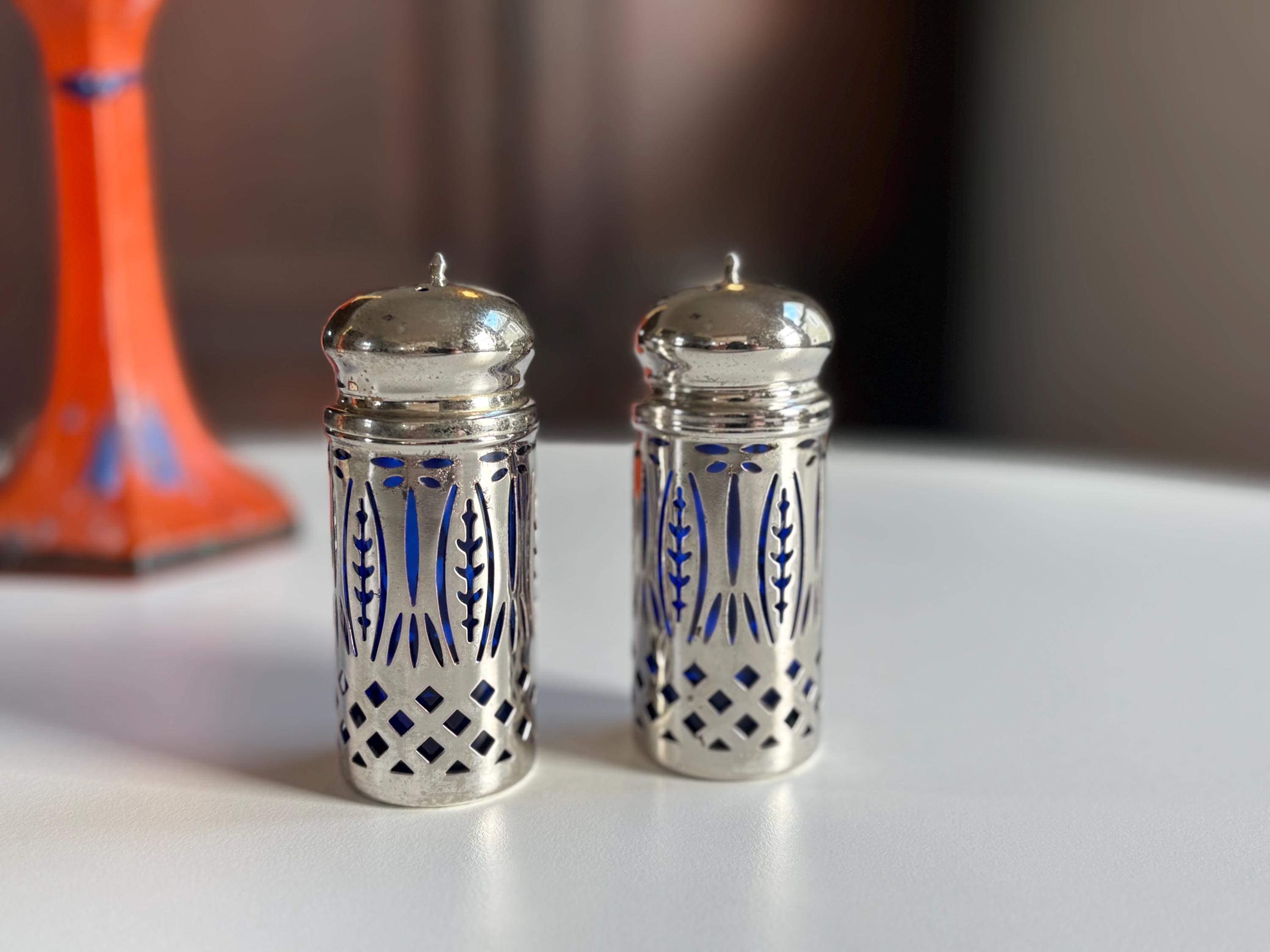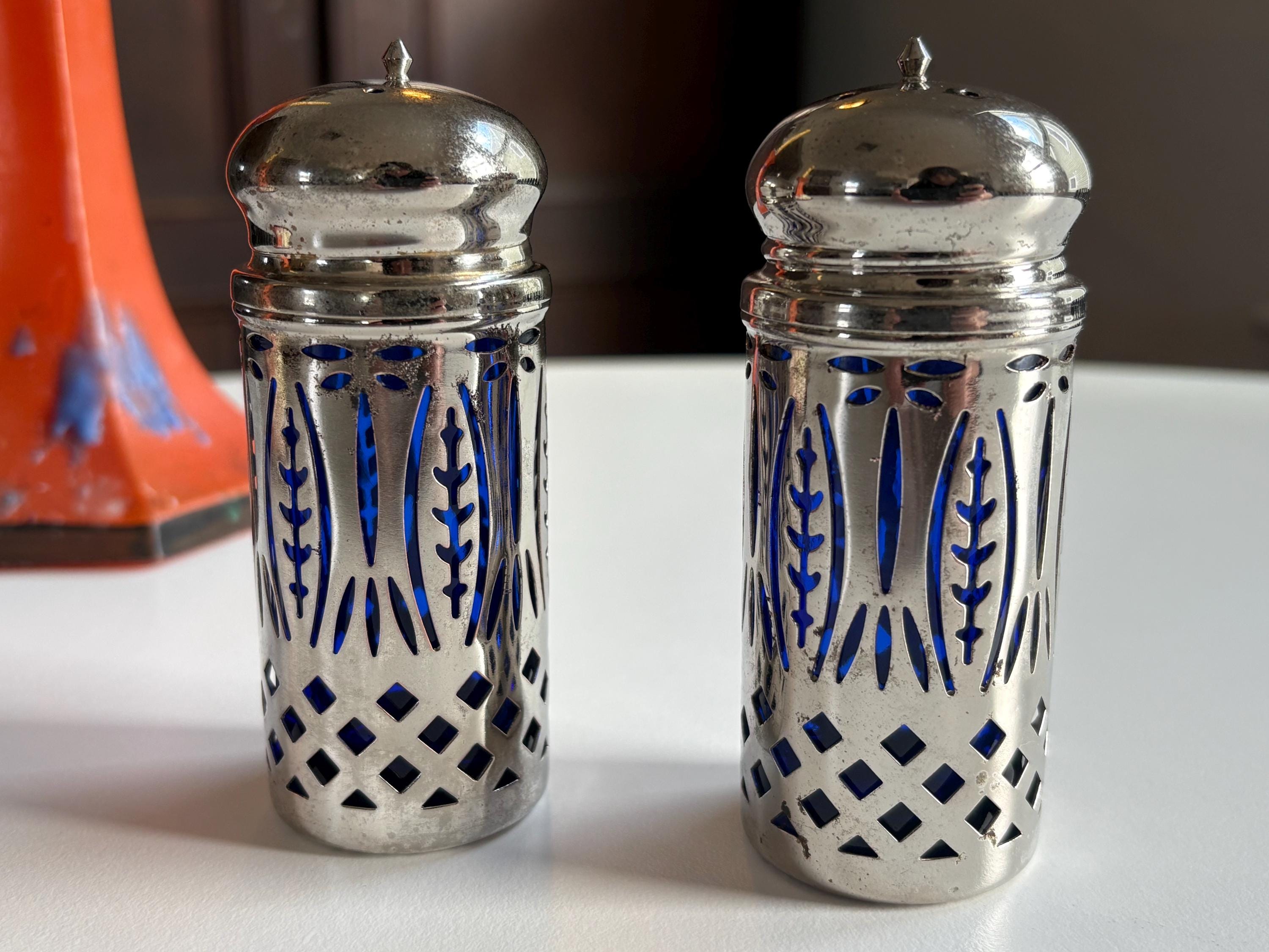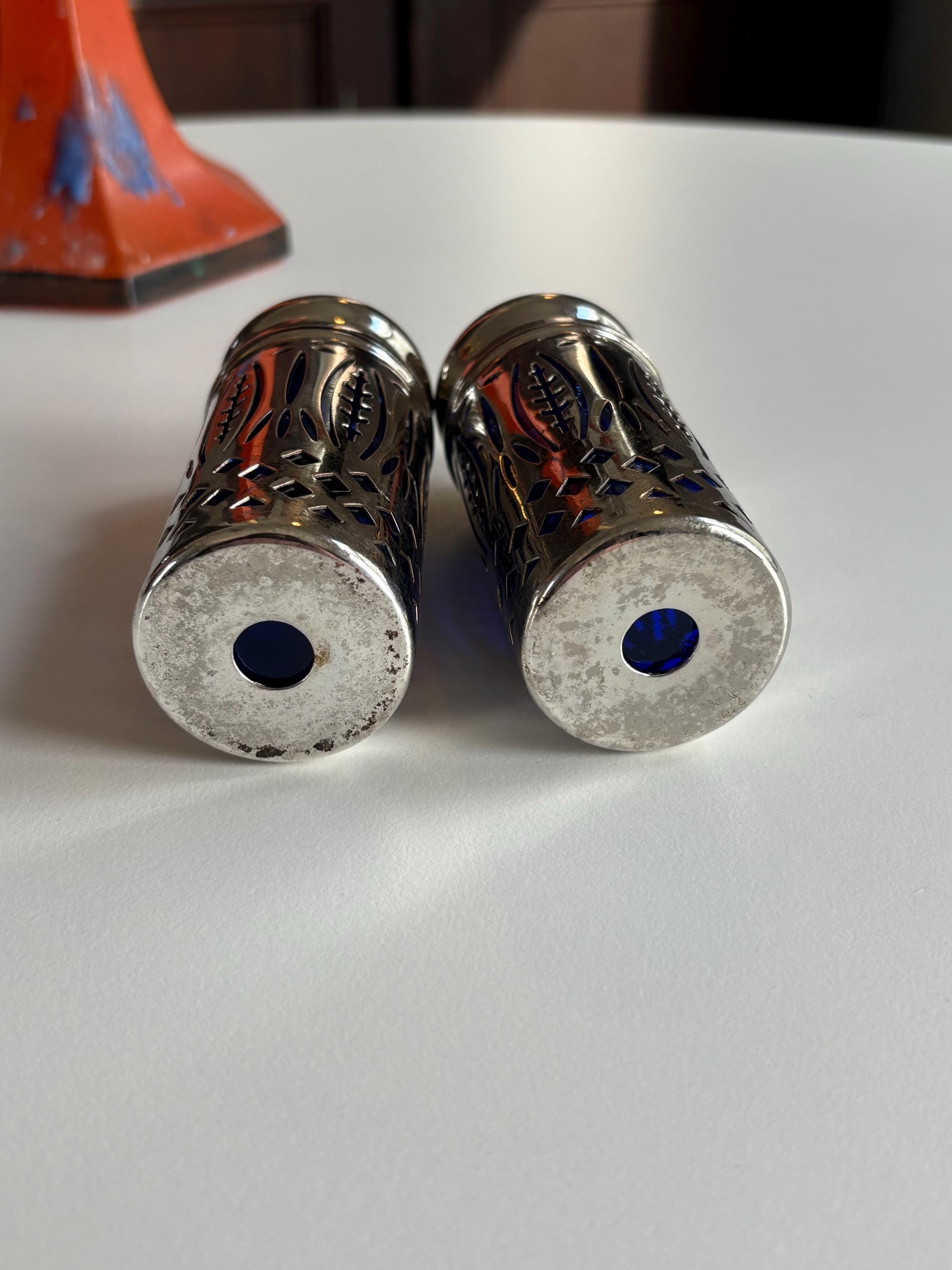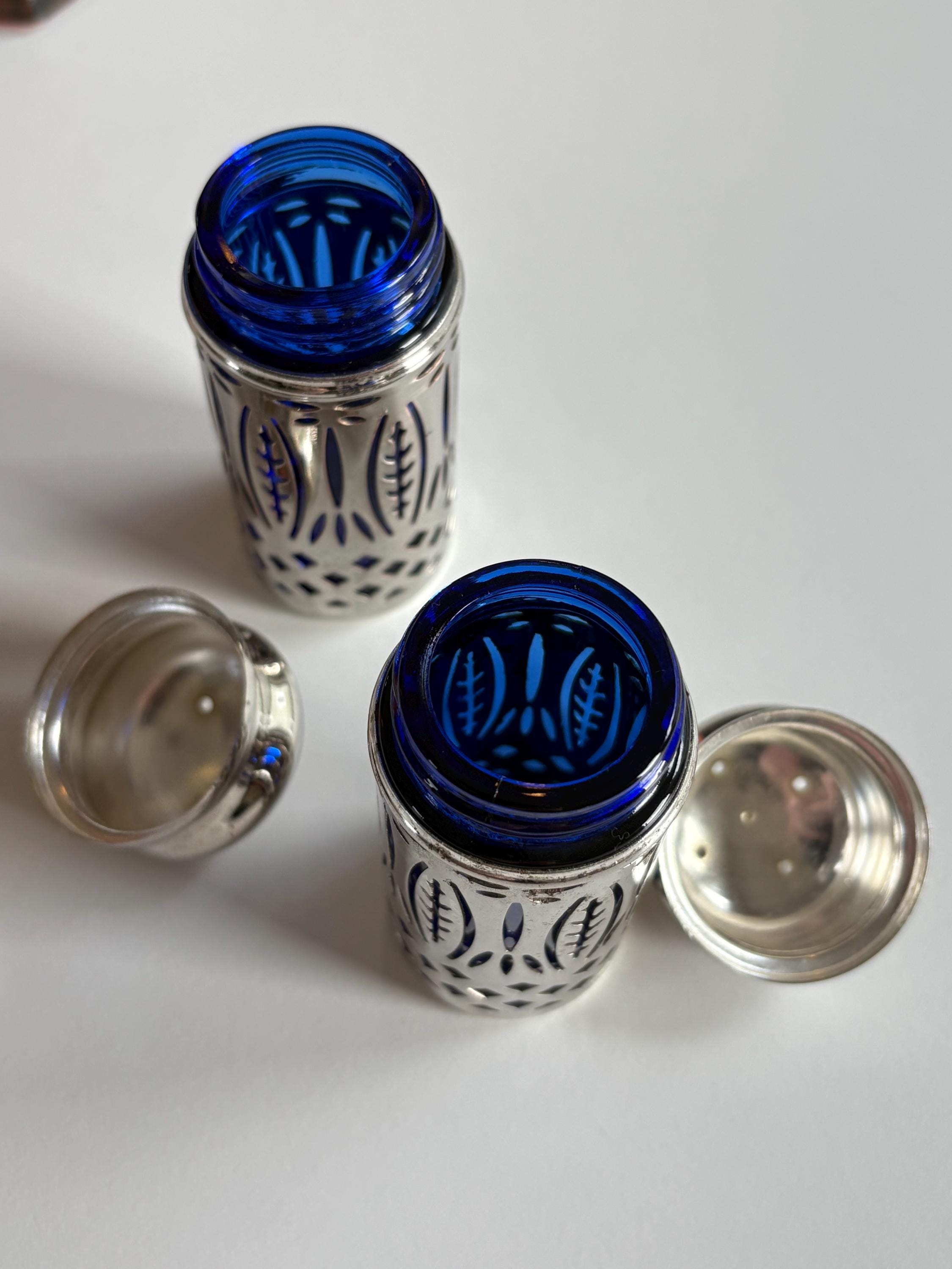 1950s Imprisoned Cobalt Glass Salt & Pepper Shakers, Silver Plated