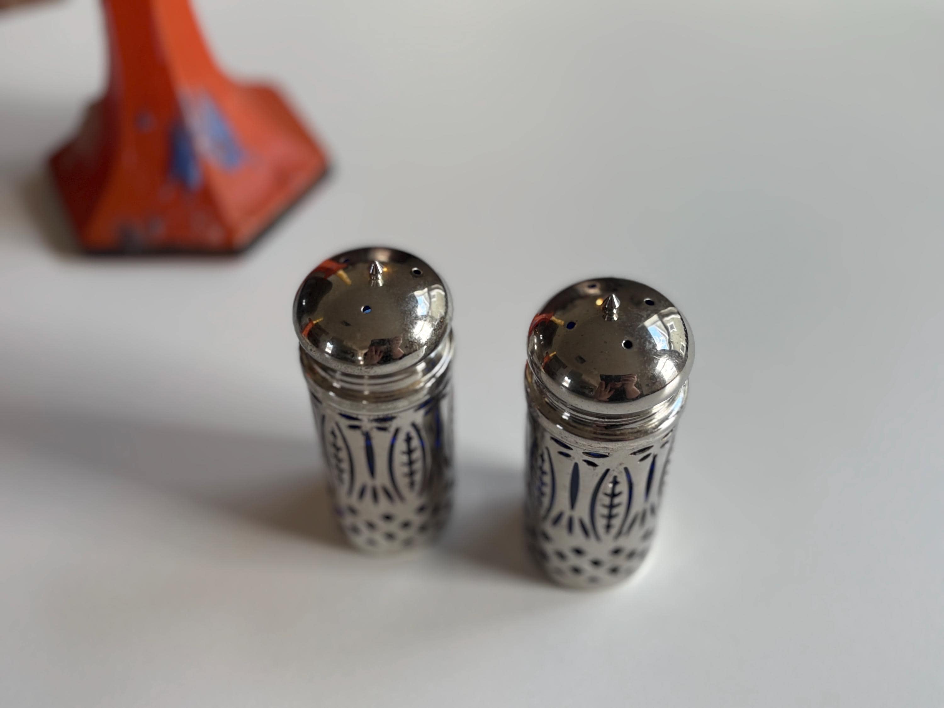 This is a set of imprisoned glass salt & pepper shakers. The metal is silver plated steel and the glass is a beautiful cobalt color. Both are in fantastic condition and recently polished, deep cleaned and ready to use! The lids are very secure and screw off easily. Both measure 4” tall and 1.5” wide at the bottom.