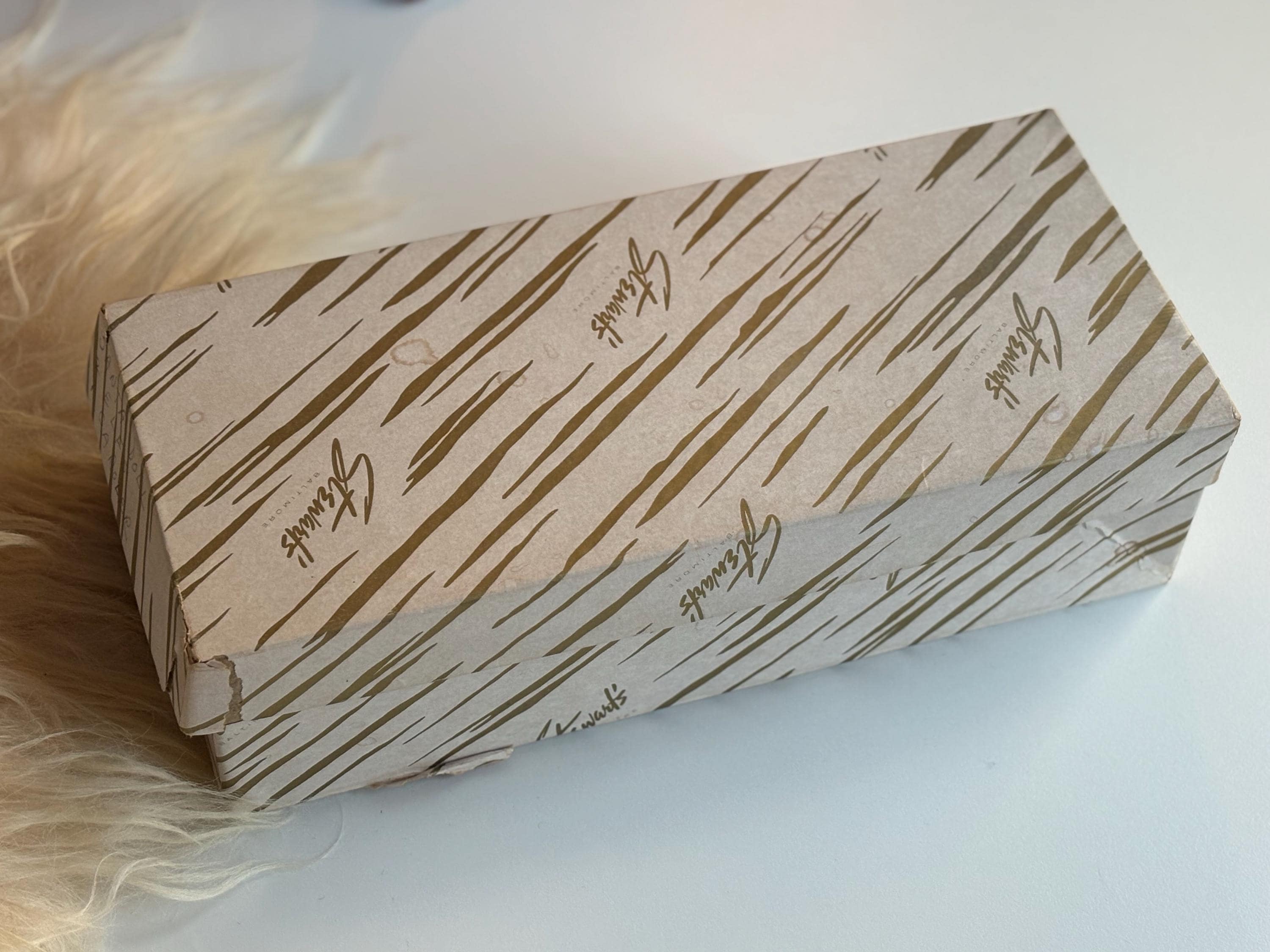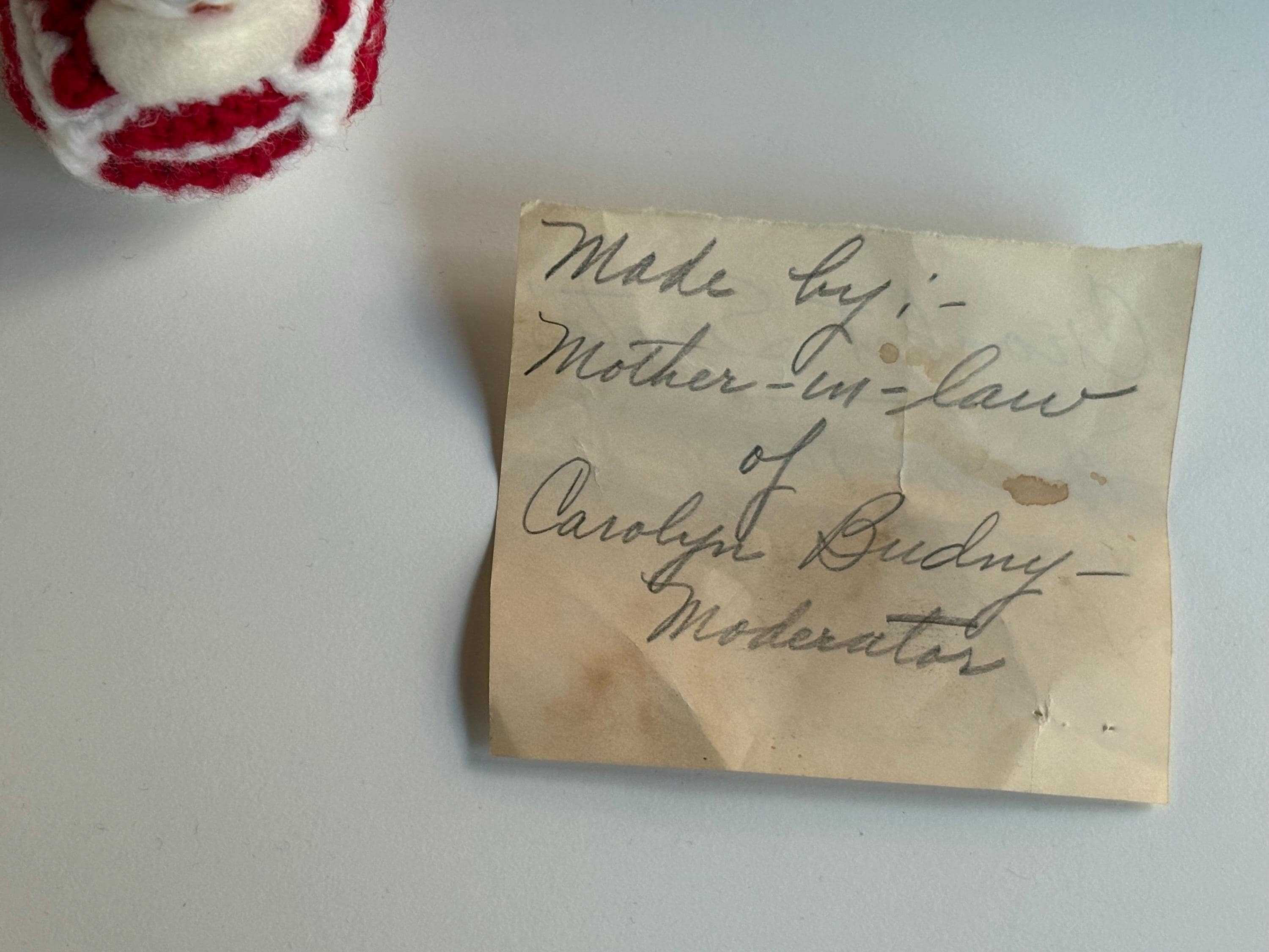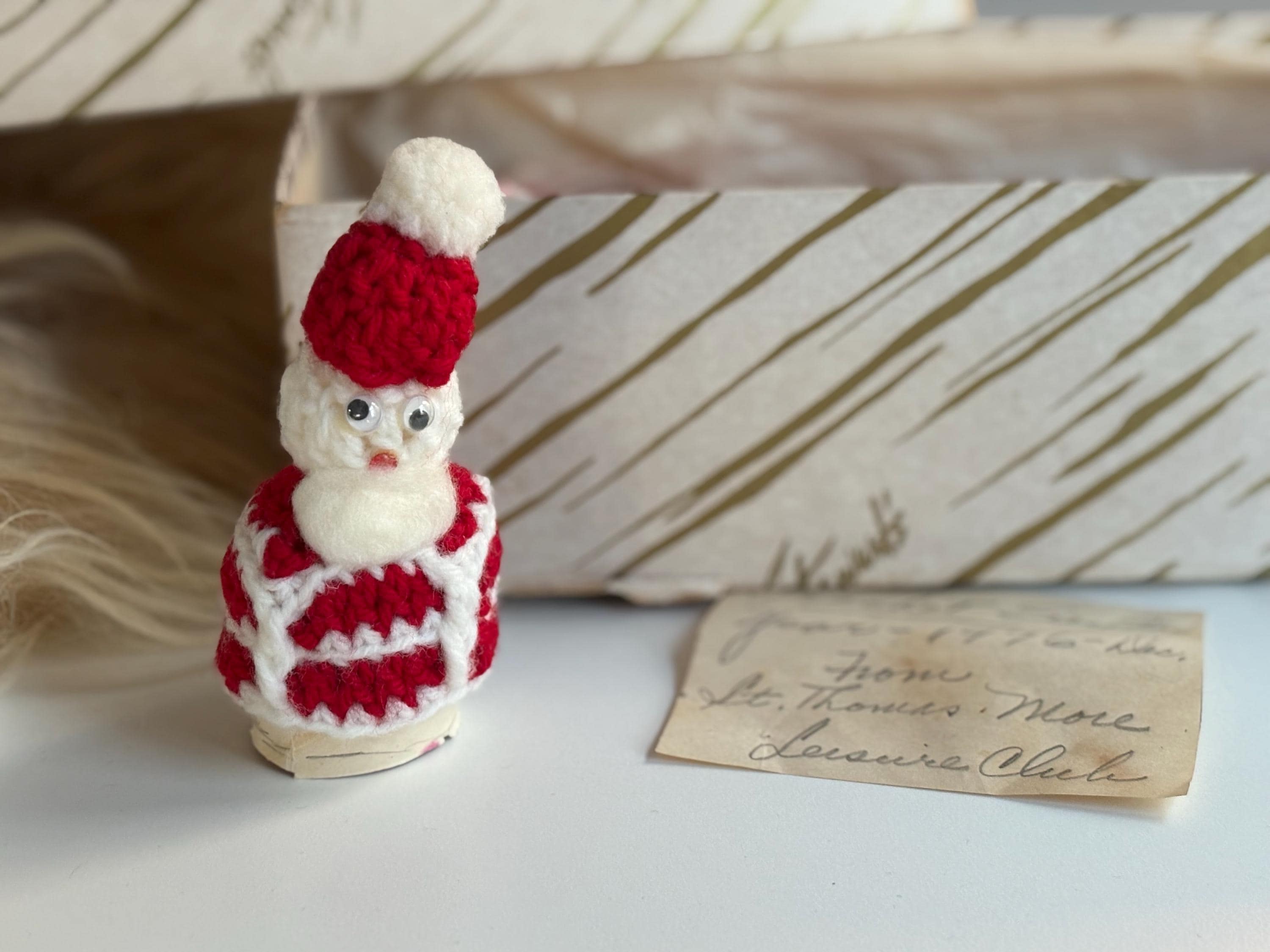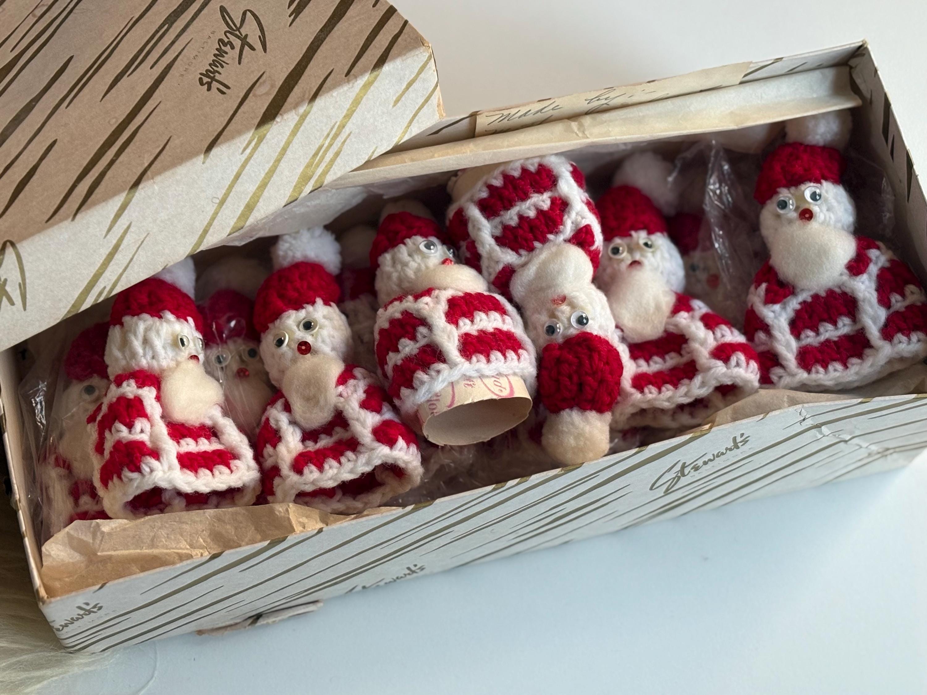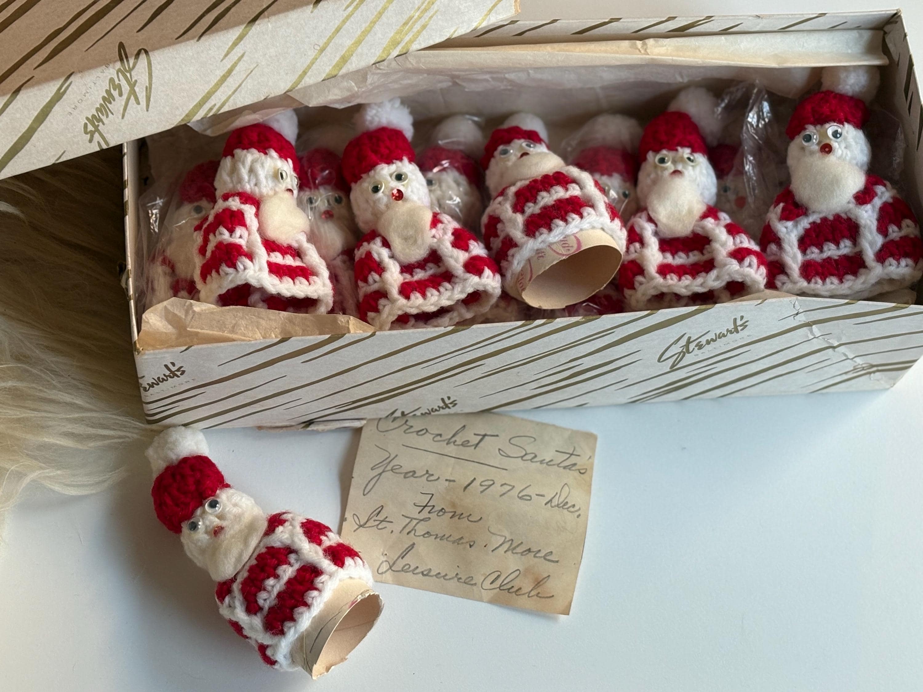This is the most adorable and lovingly made set of 12 crocheted Santa decorations which can stand with the help of a toilet paper roll or use them as bottle toppers, or add a string to make them ornaments. A note from the original maker & family was carefully left in the box so we have maintained its history by keeping it as found. So many great possibilities with these knitted Santa figures! Ships in original box.