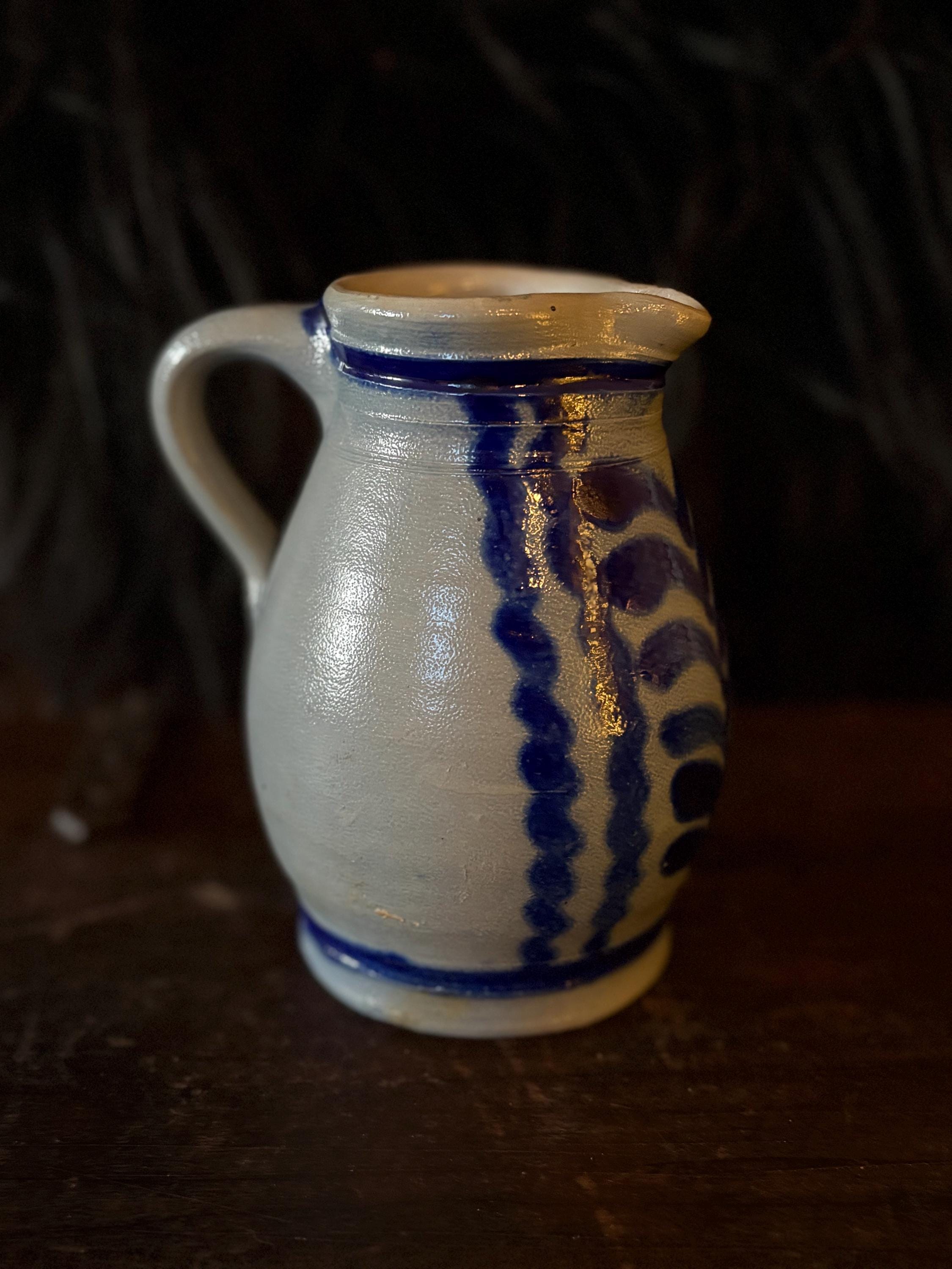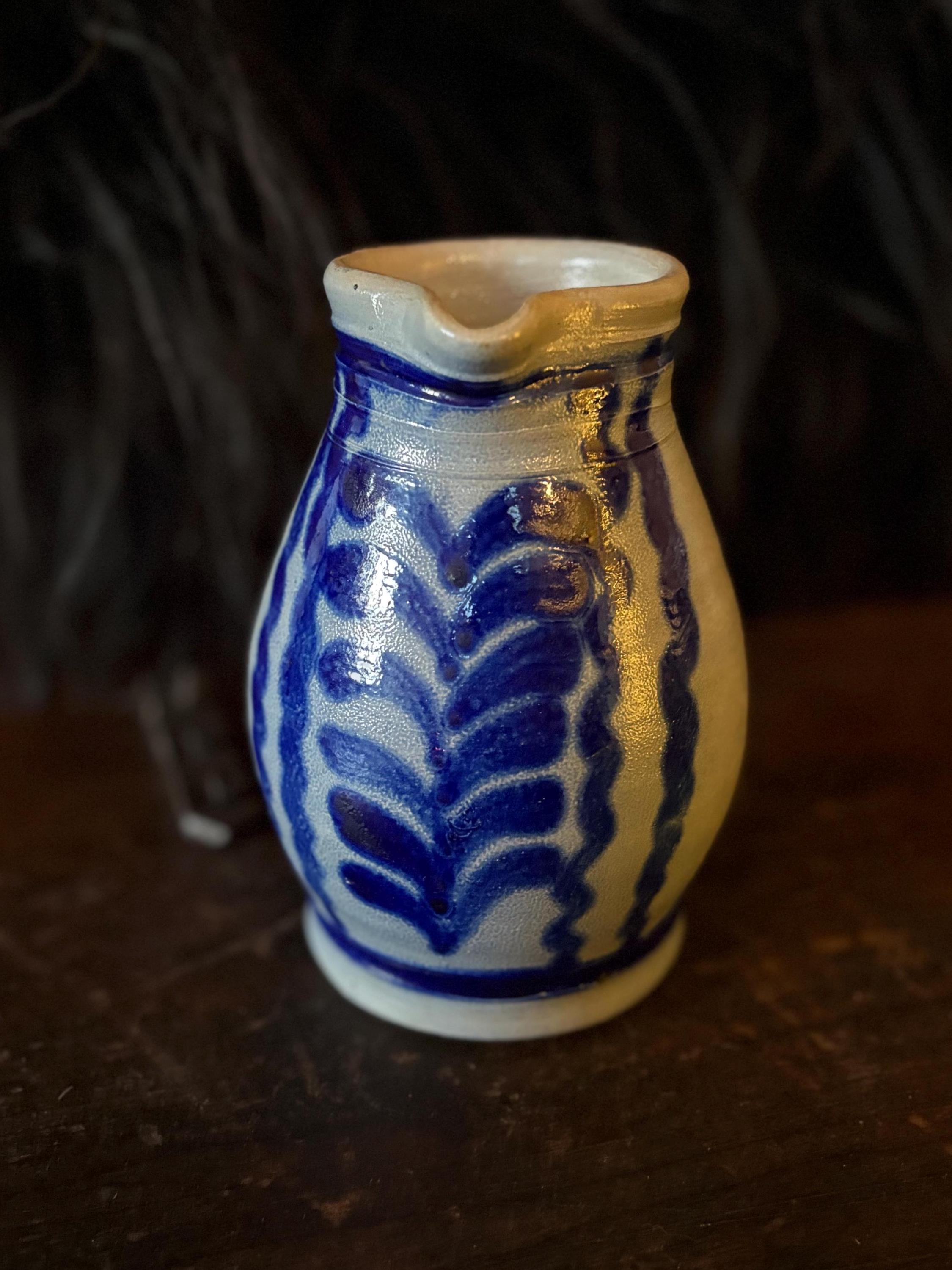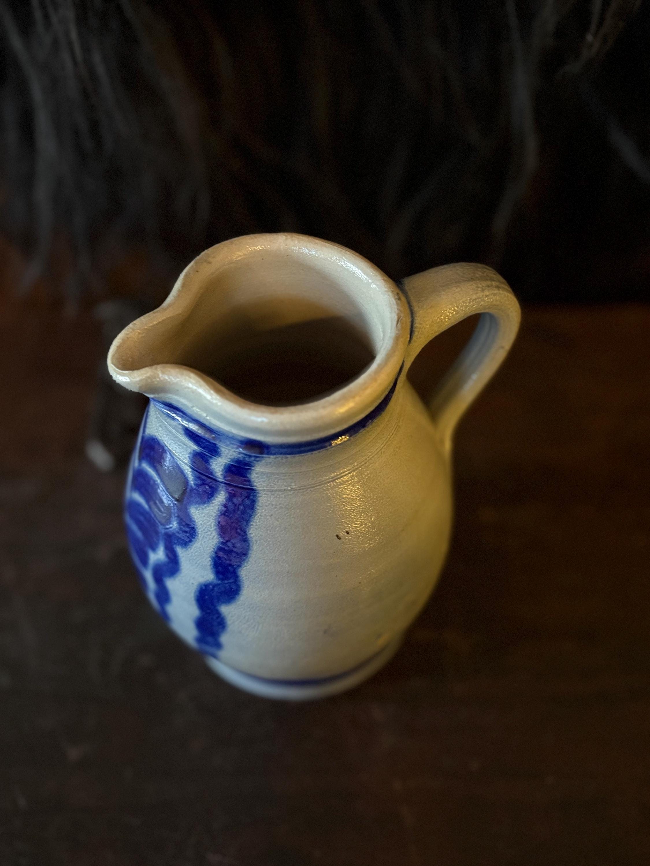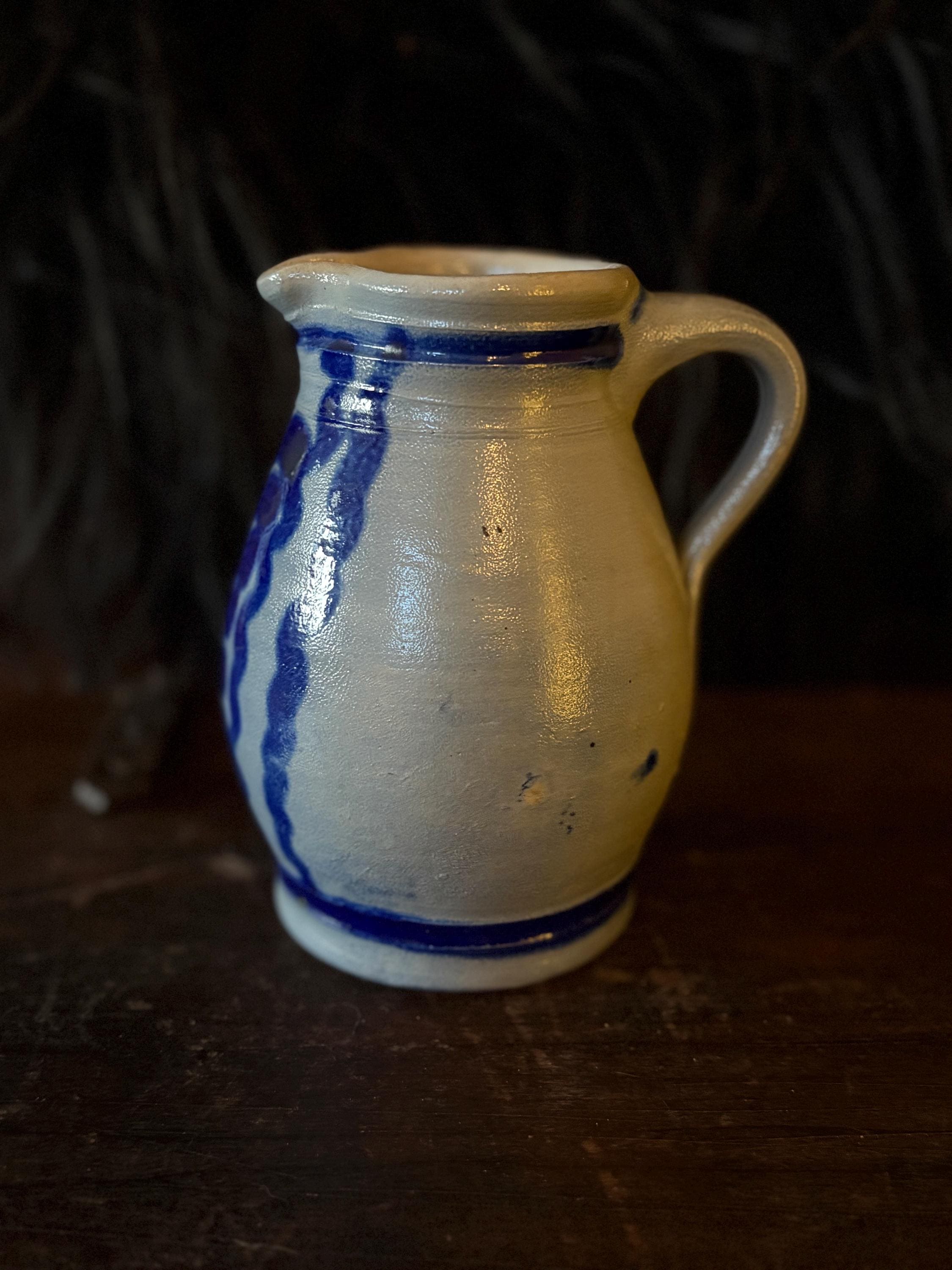 A gorgeous little stoneware pitcher made in West Germany circa 1970. It is in pristine condition with striking cobalt blue salt glaze on grey clay with warm hues from firing. This pitcher stands approximately 5.75” high which makes it a great creamer when having guests. The opening is about 2.75” wide and the bottom is 3.25” wide. This piece is stamped “West Germany” on the bottom. A beautiful piece for the primitive kitchen!