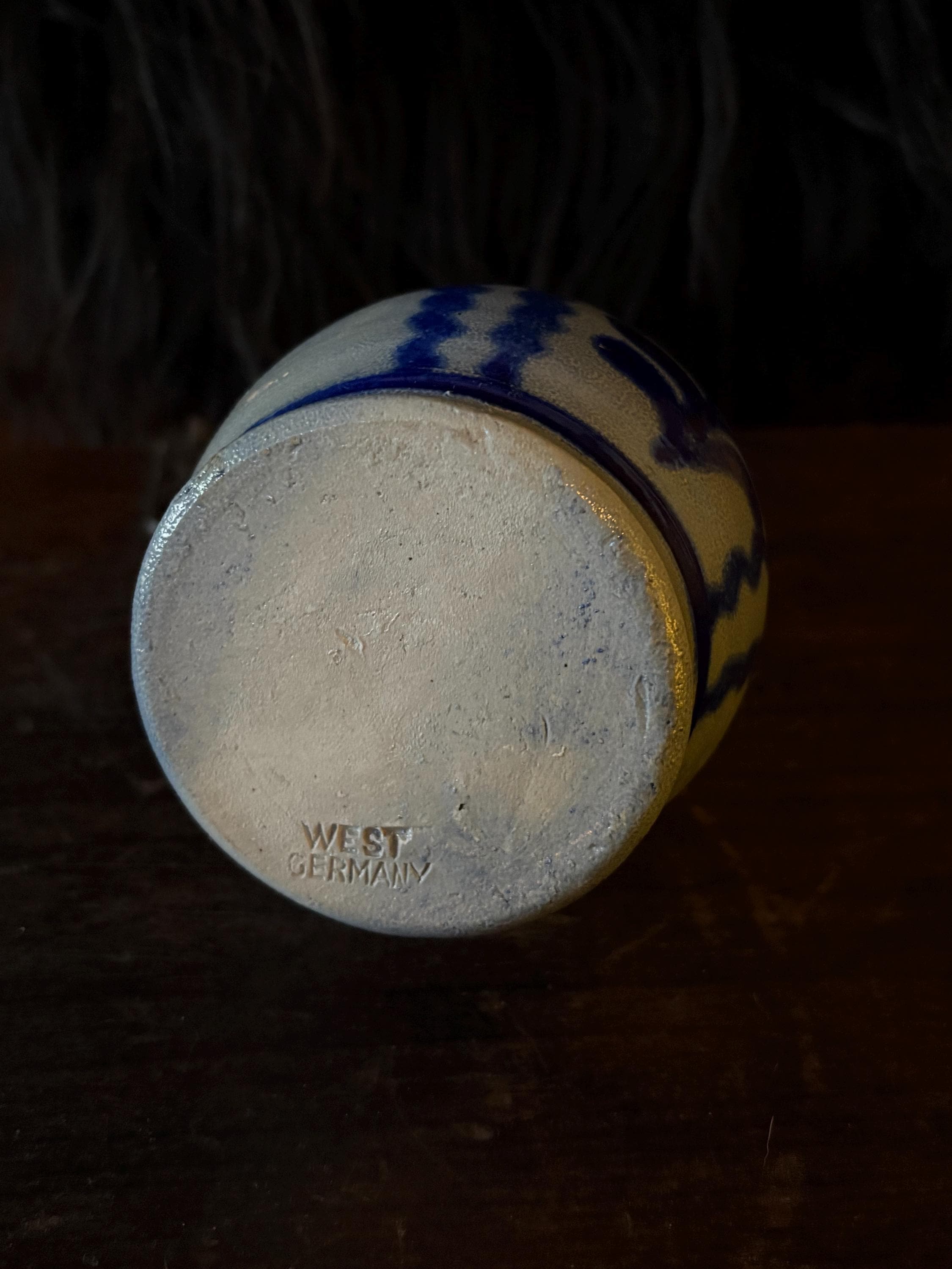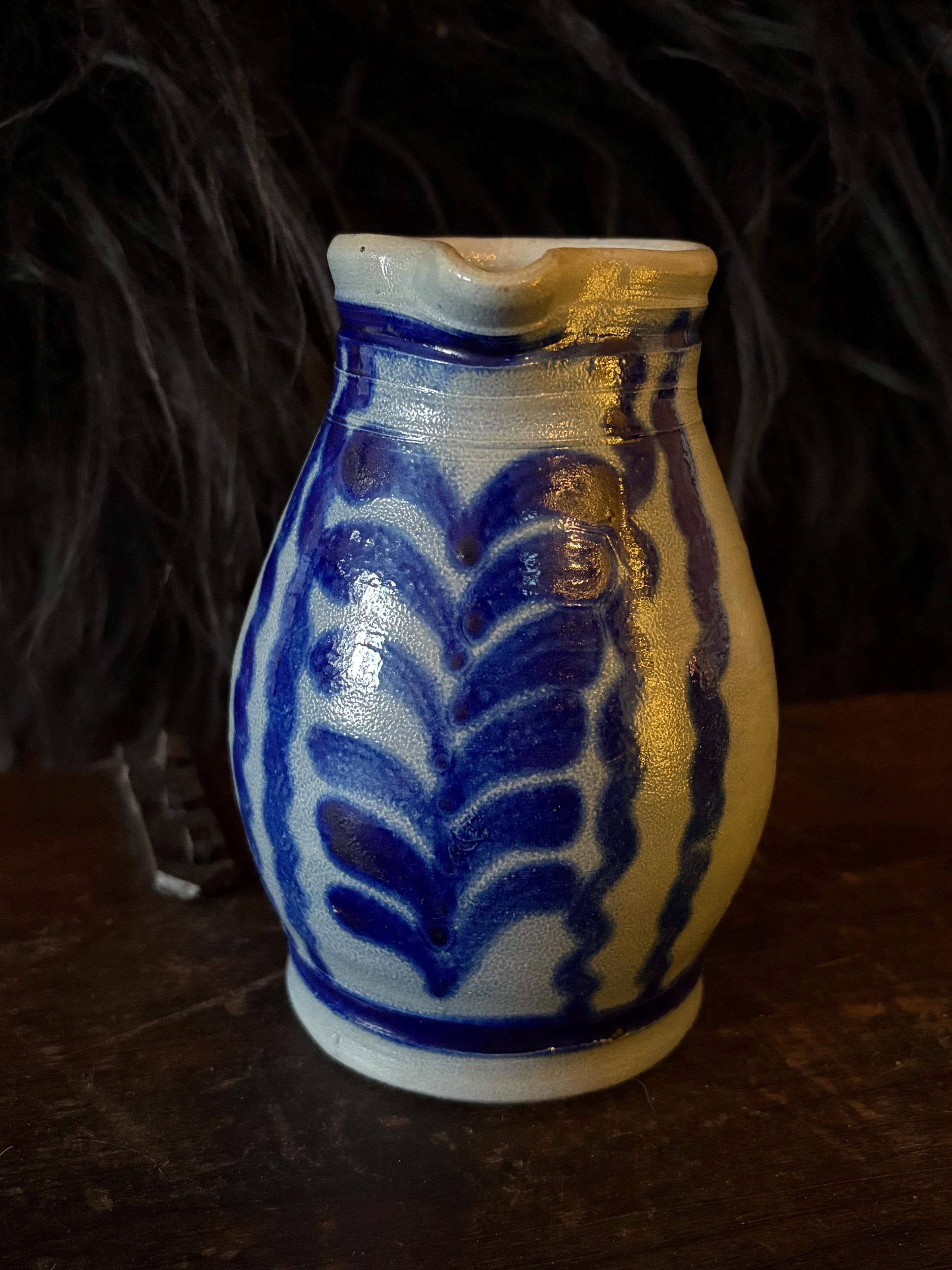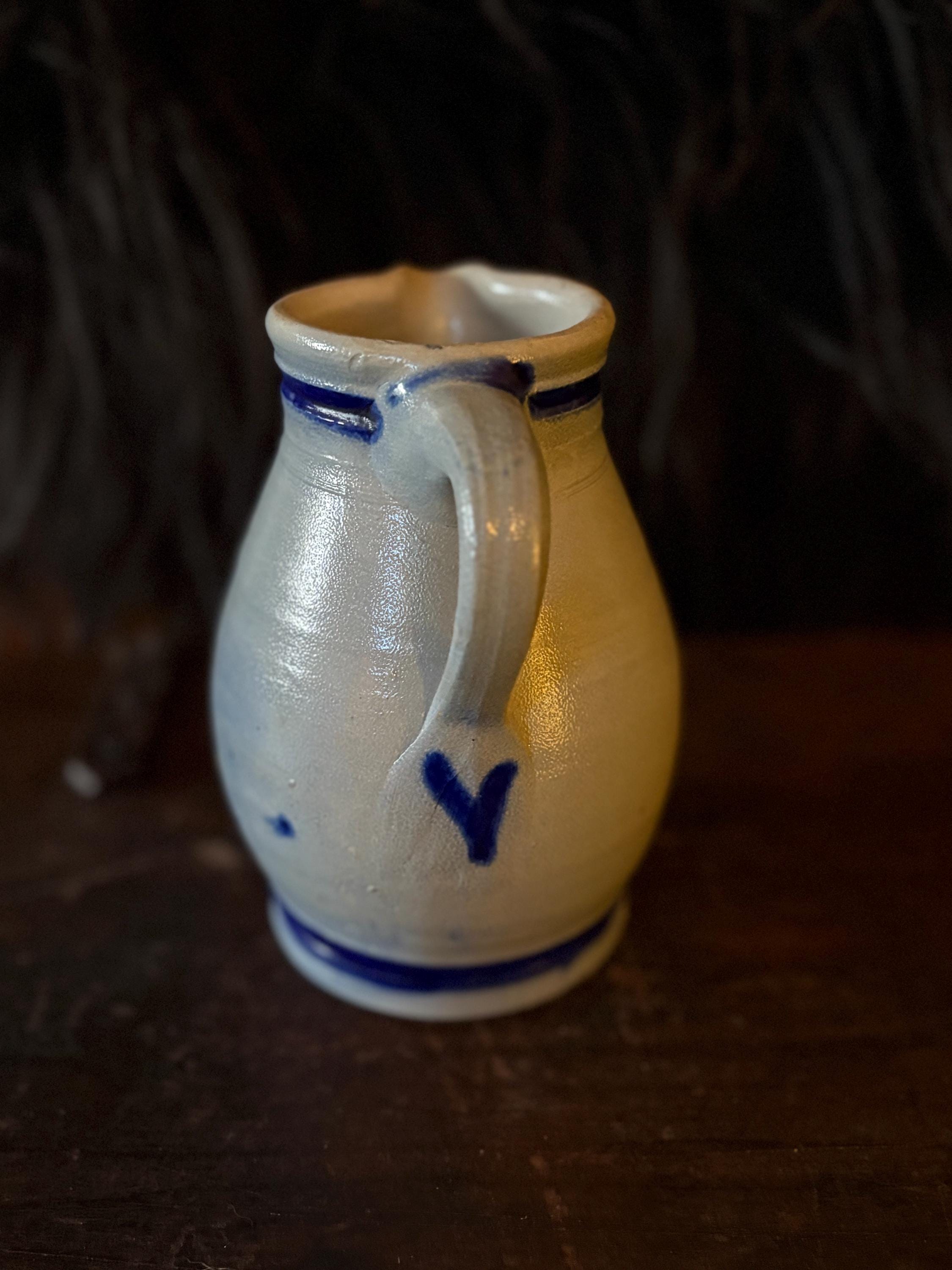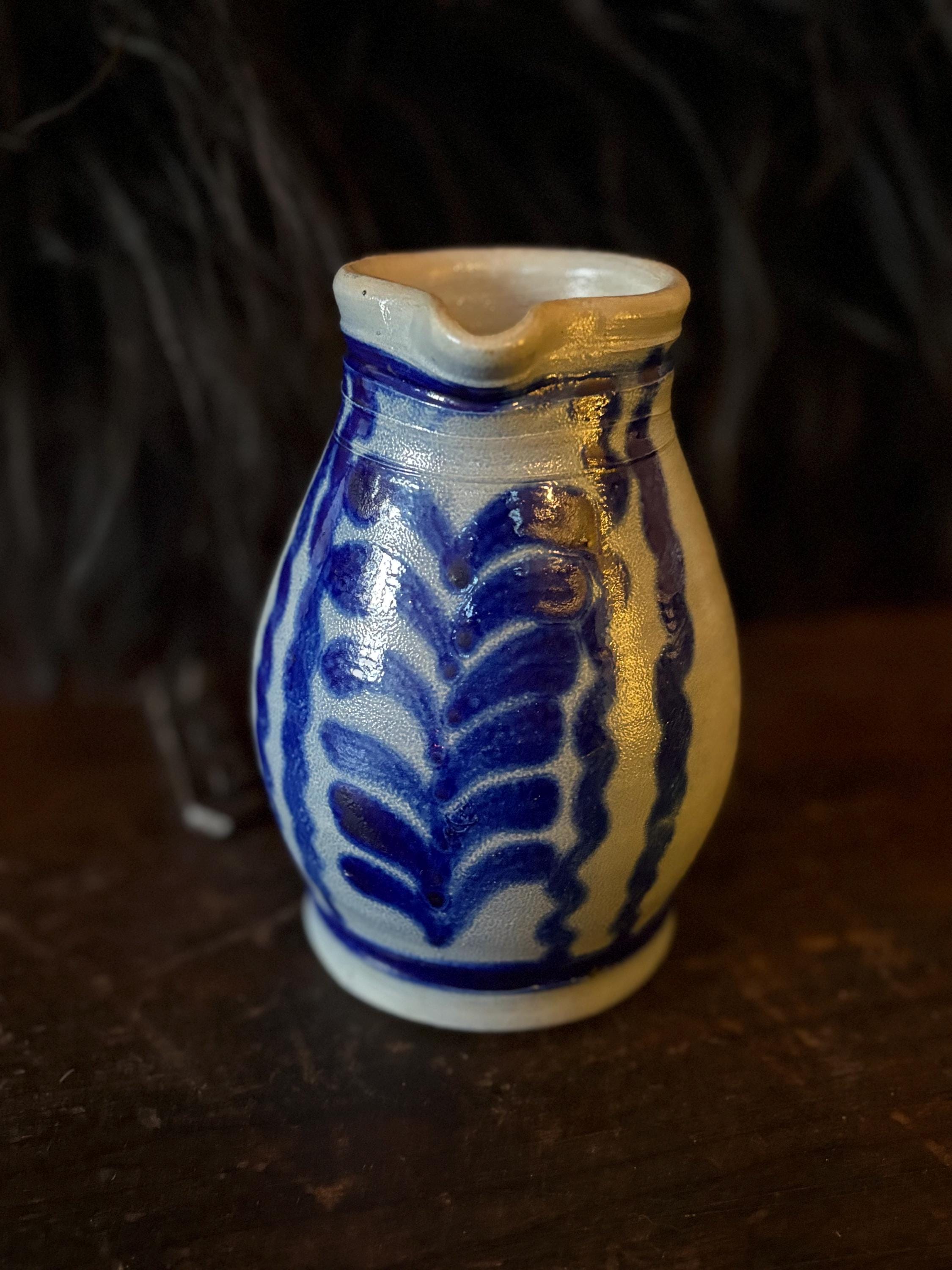 A gorgeous little stoneware pitcher made in West Germany circa 1970. It is in pristine condition with striking cobalt blue salt glaze on grey clay with warm hues from firing. This pitcher stands approximately 5.75” high which makes it a great creamer when having guests. The opening is about 2.75” wide and the bottom is 3.25” wide. This piece is stamped “West Germany” on the bottom. A beautiful piece for the primitive kitchen!