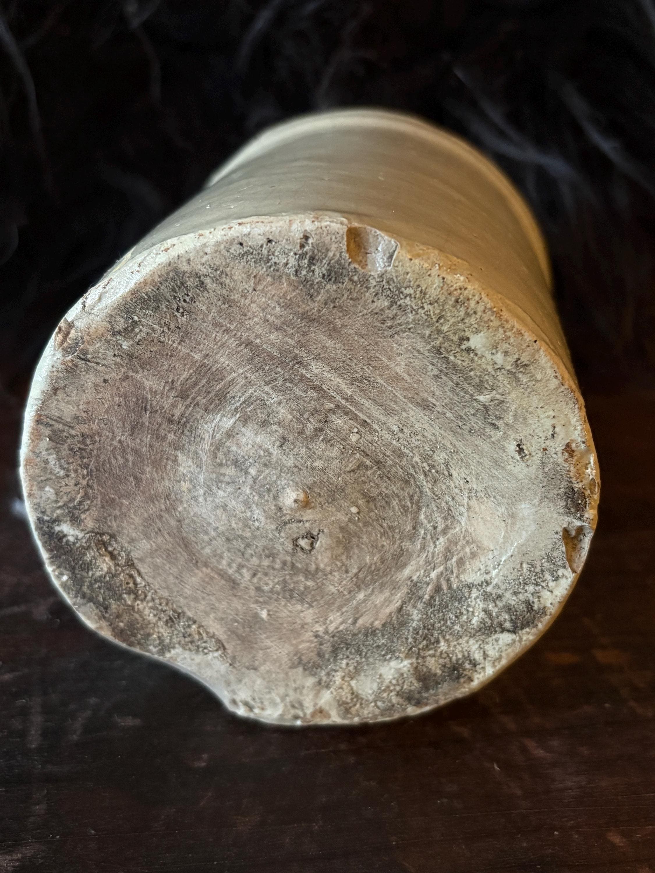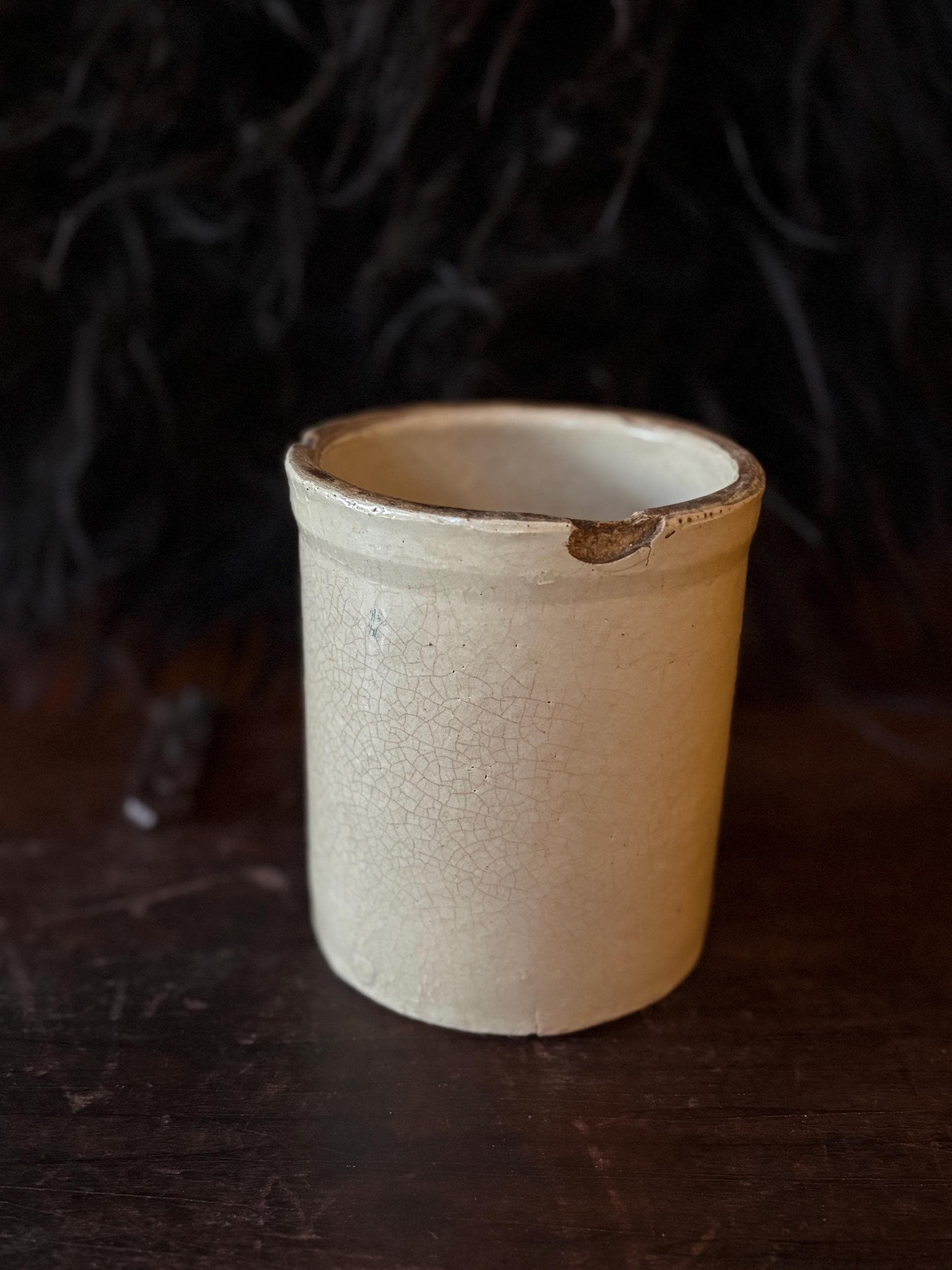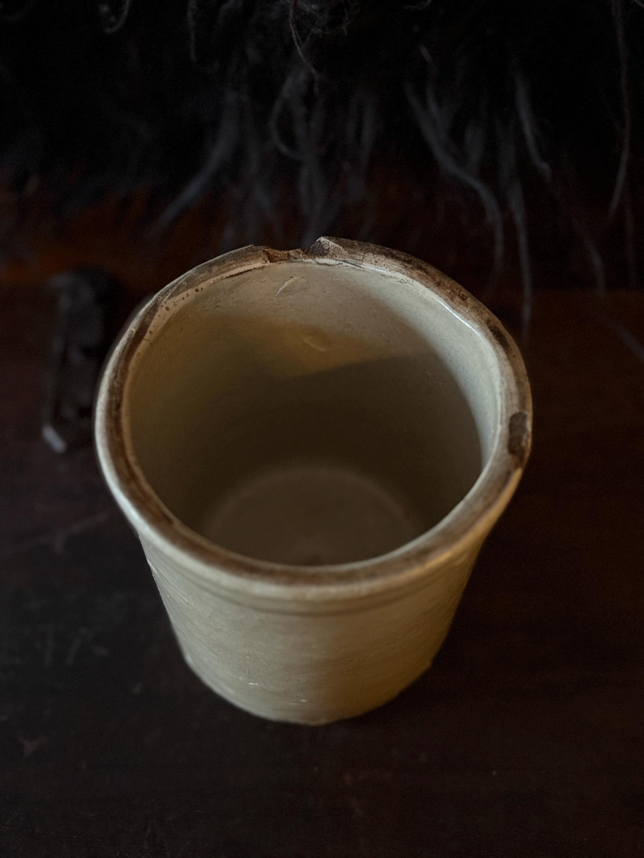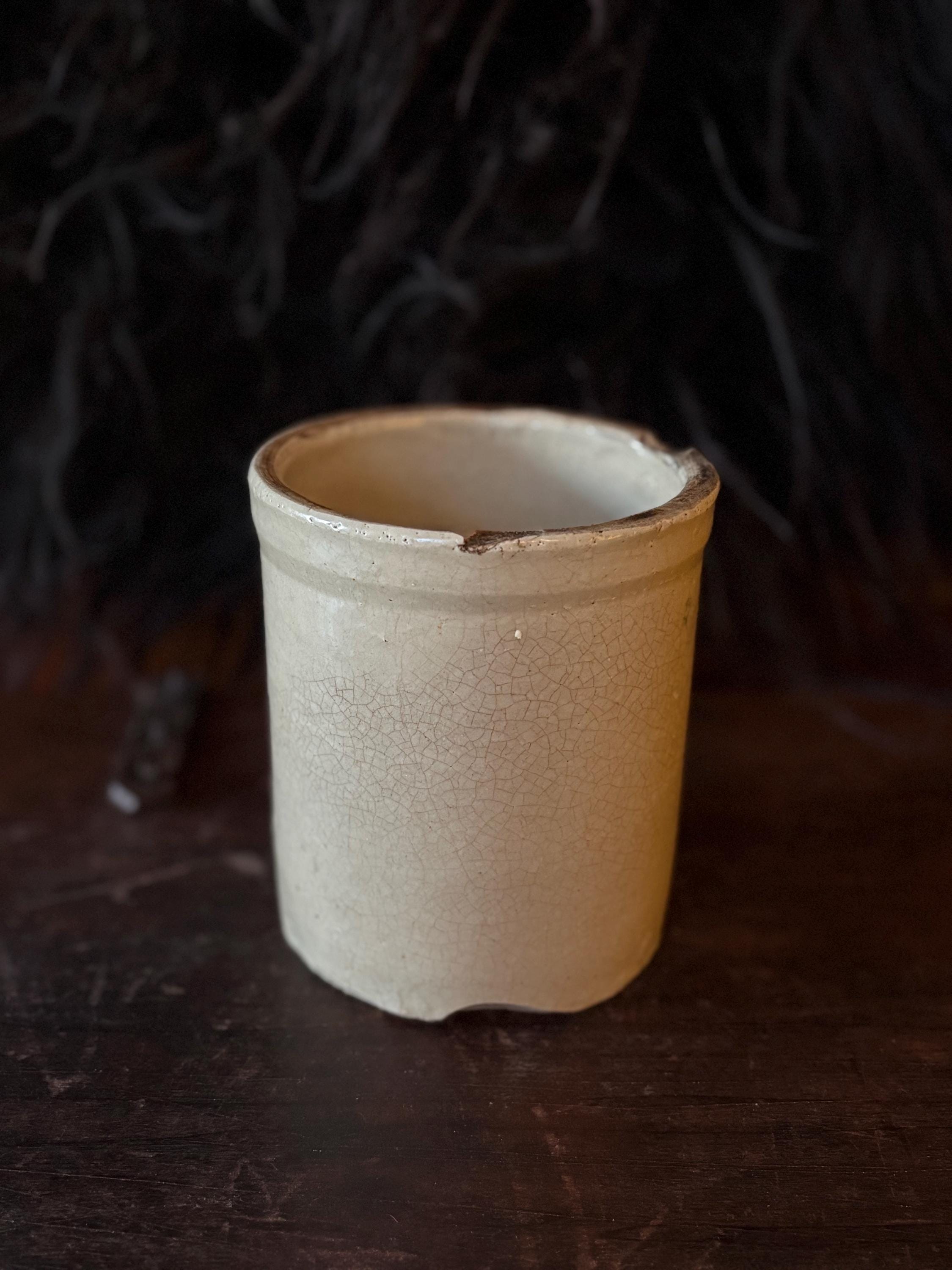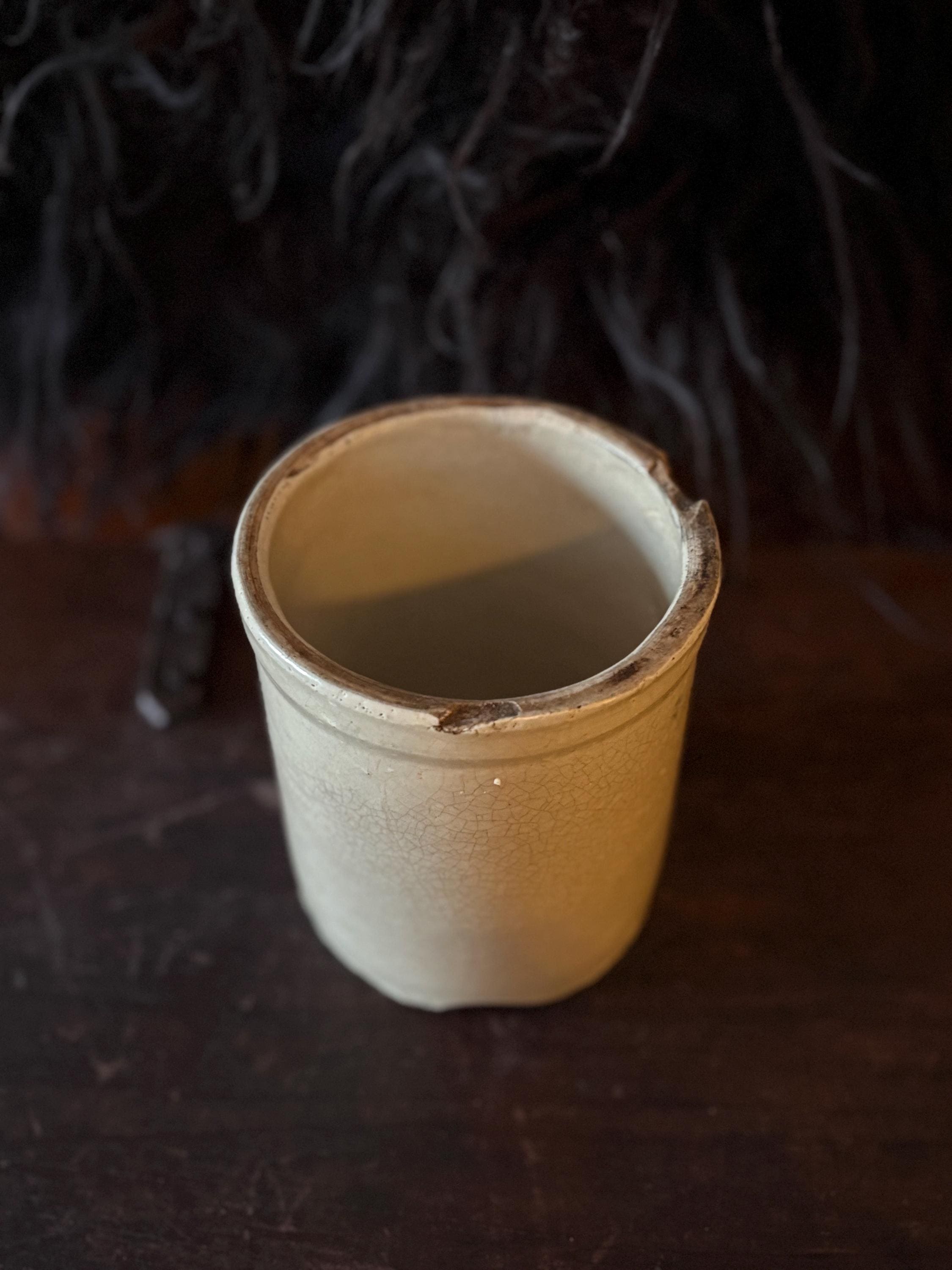 A great antique for the primitive kitchen. Perfect for keeping clothespins for snacks, small utensils, brushes or to just add to your collectible display. It has seen some use and has some expected ware because of this. There are chips throughout the crock but none of them effect its structure. This is an older crock likely for snuff or pickling, circa early 1900s. Stands approximately 5” tall and 4.5” wide. This piece seems to have been marked but has faded significantly and is hard to make out.