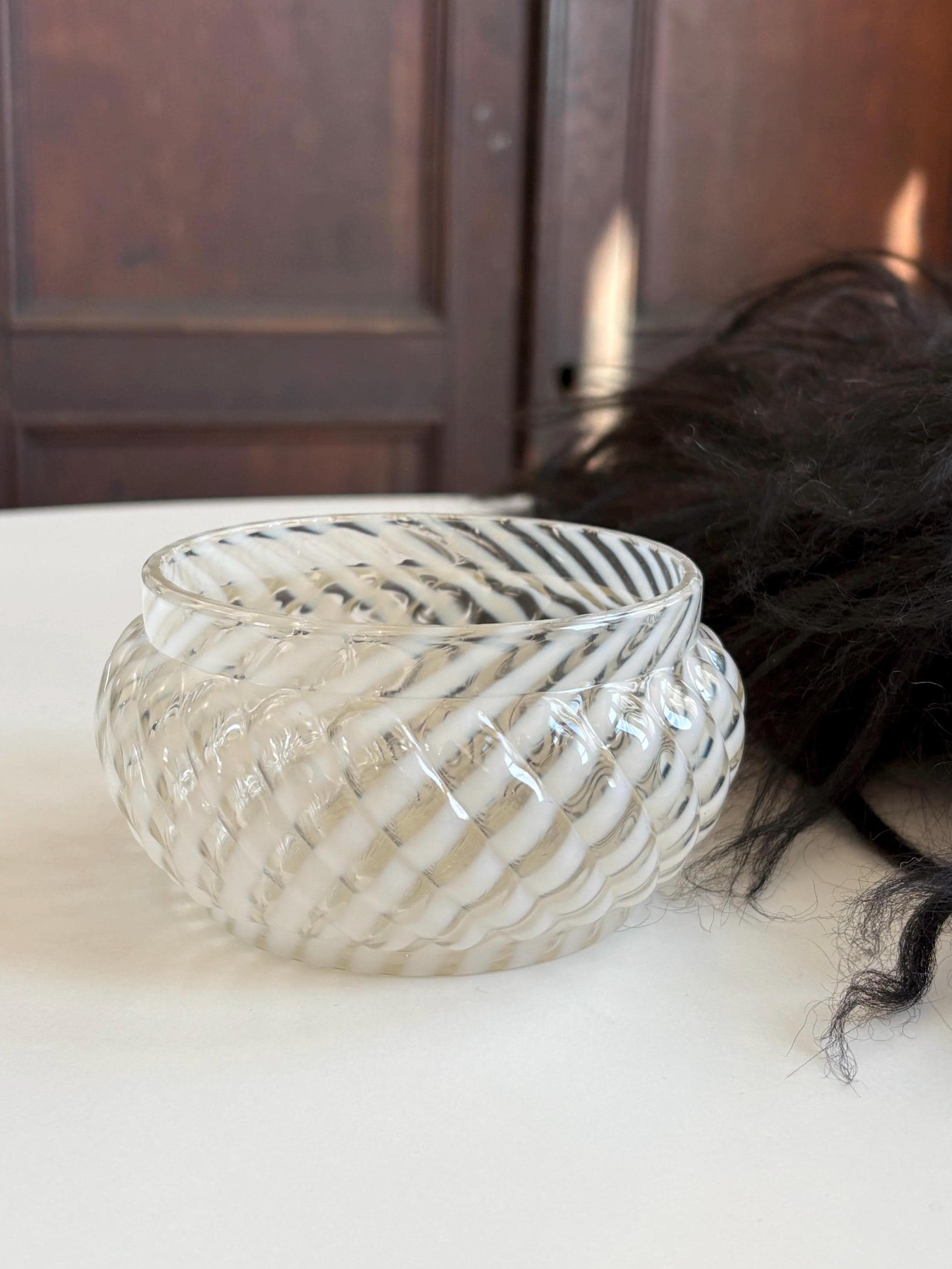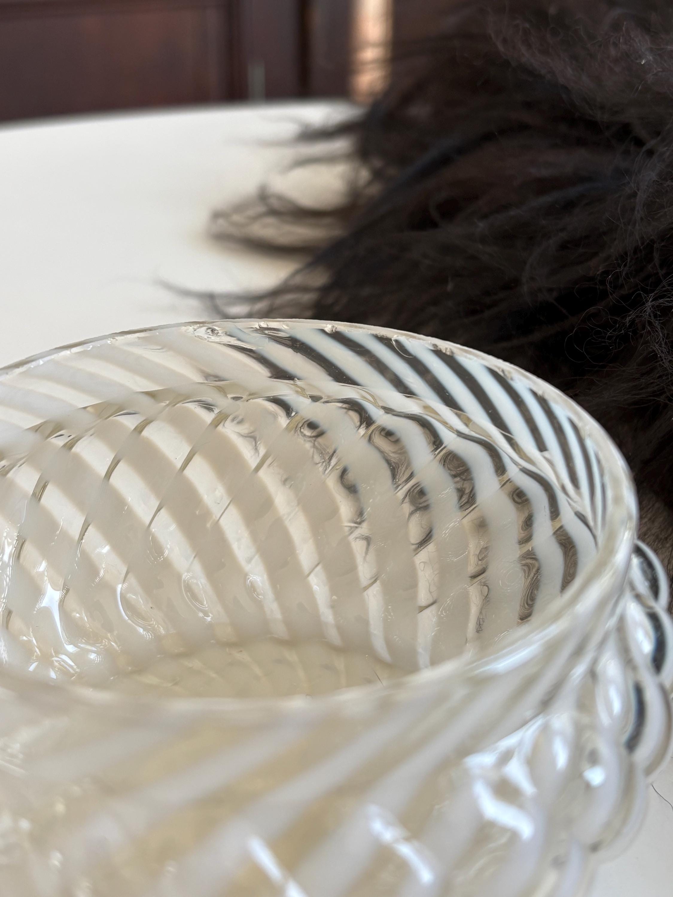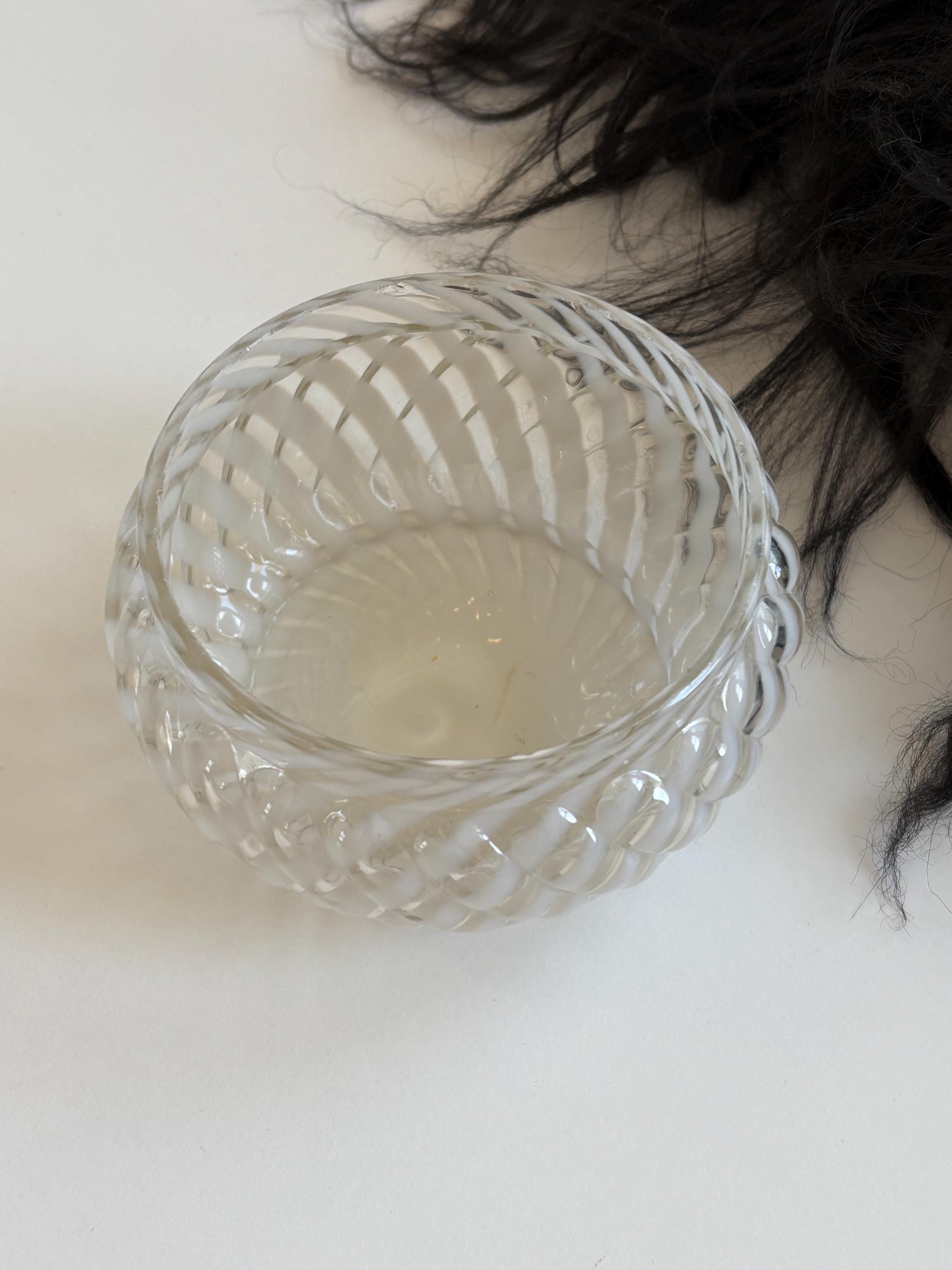 This is a gorgeous EAPG (Early American Swirl Glads) berry bowl with clear and opalescent reverse swirl or “buckeye” pattern, likely 1880s. It is a small bowl, approx 4.5” in diameter. There are small, very fine chips on the inside of the bowl and the price reflects this. Please view all images closely as they are a part of the description. You can view a close up of the chips in image 3. This quaint glass bowl is in otherwise great condition and the chips do not affect it functionality or charm and in fact lend to its long standing presence in this world—hand blown ages ago!
