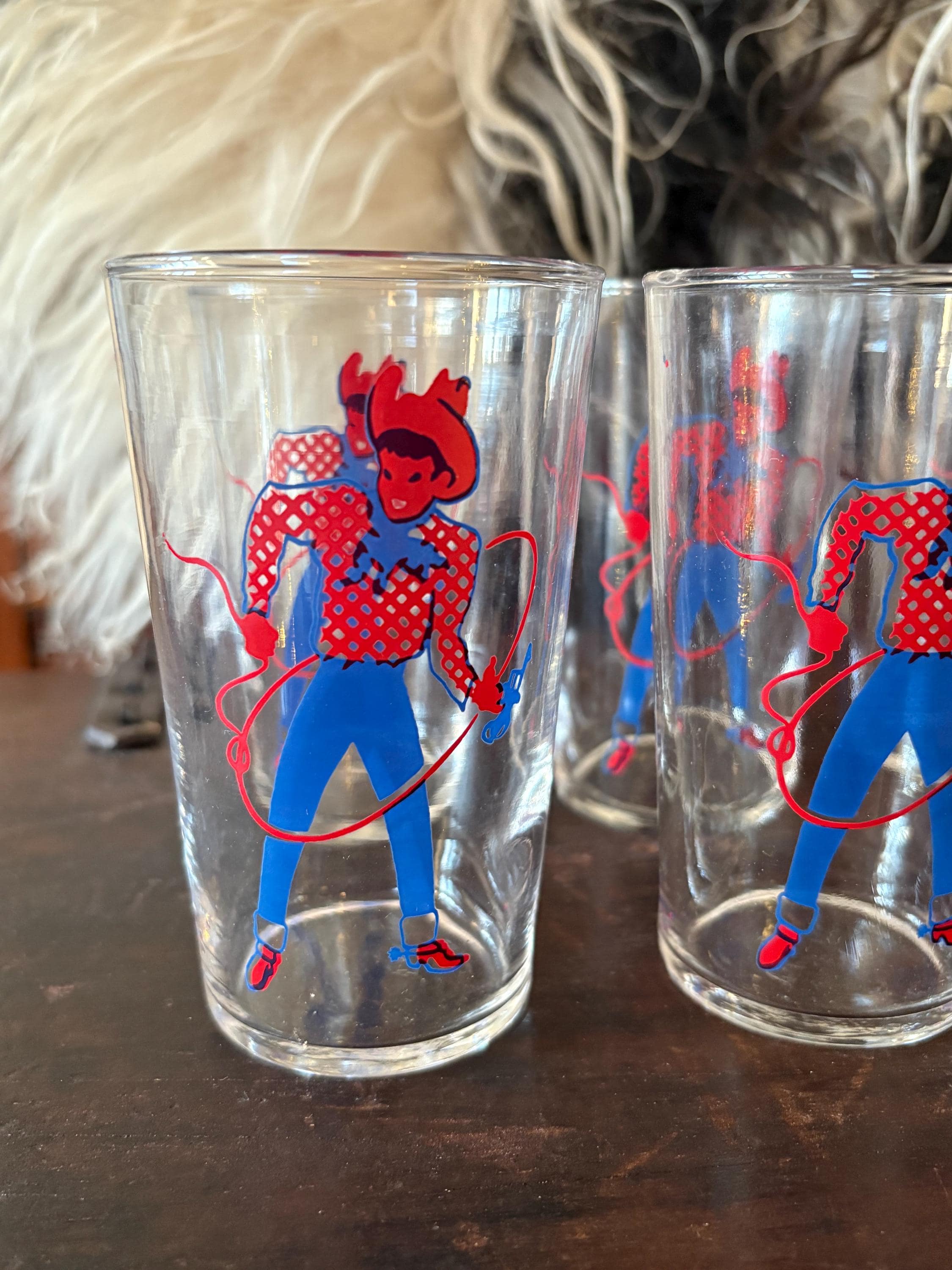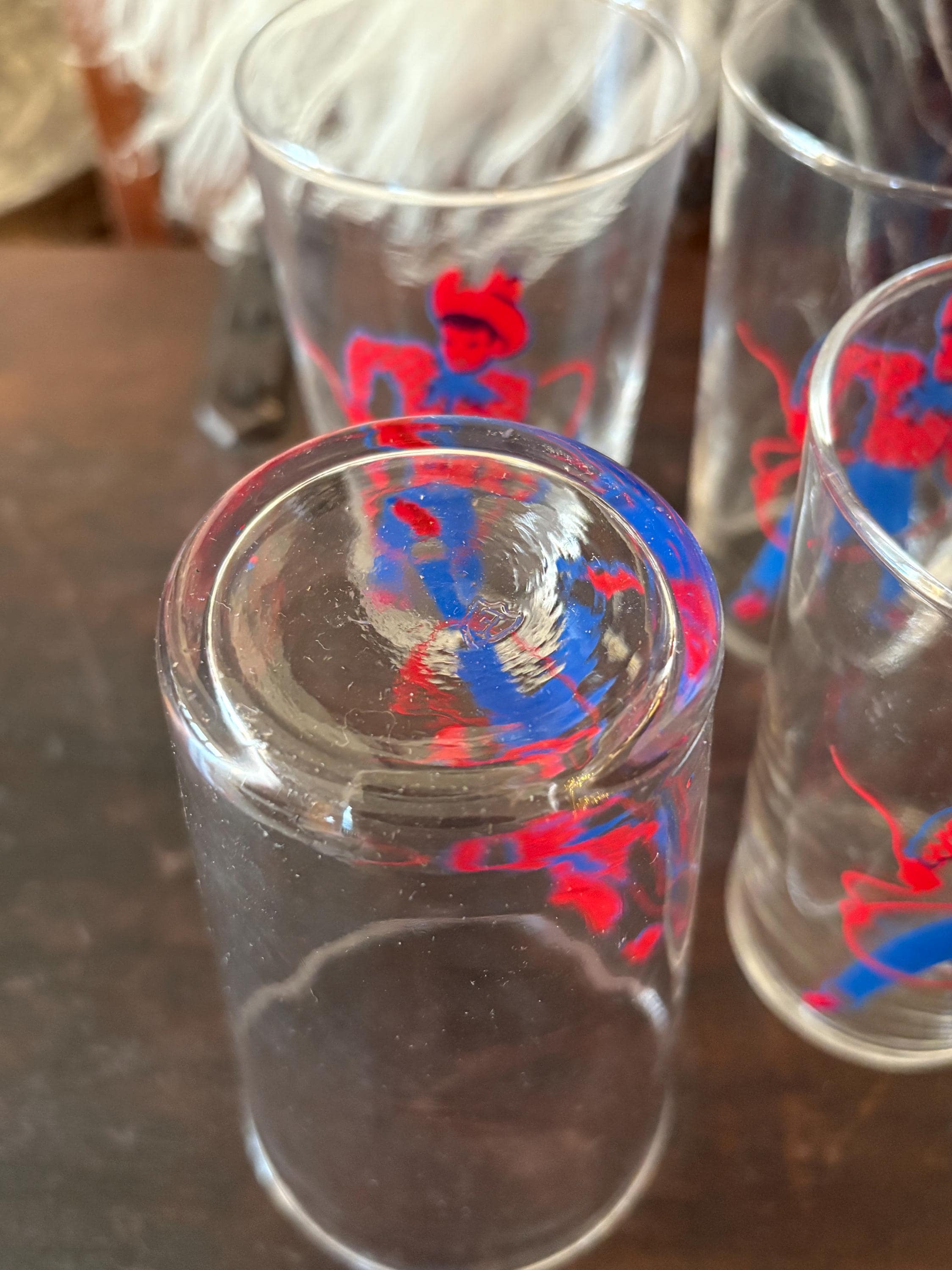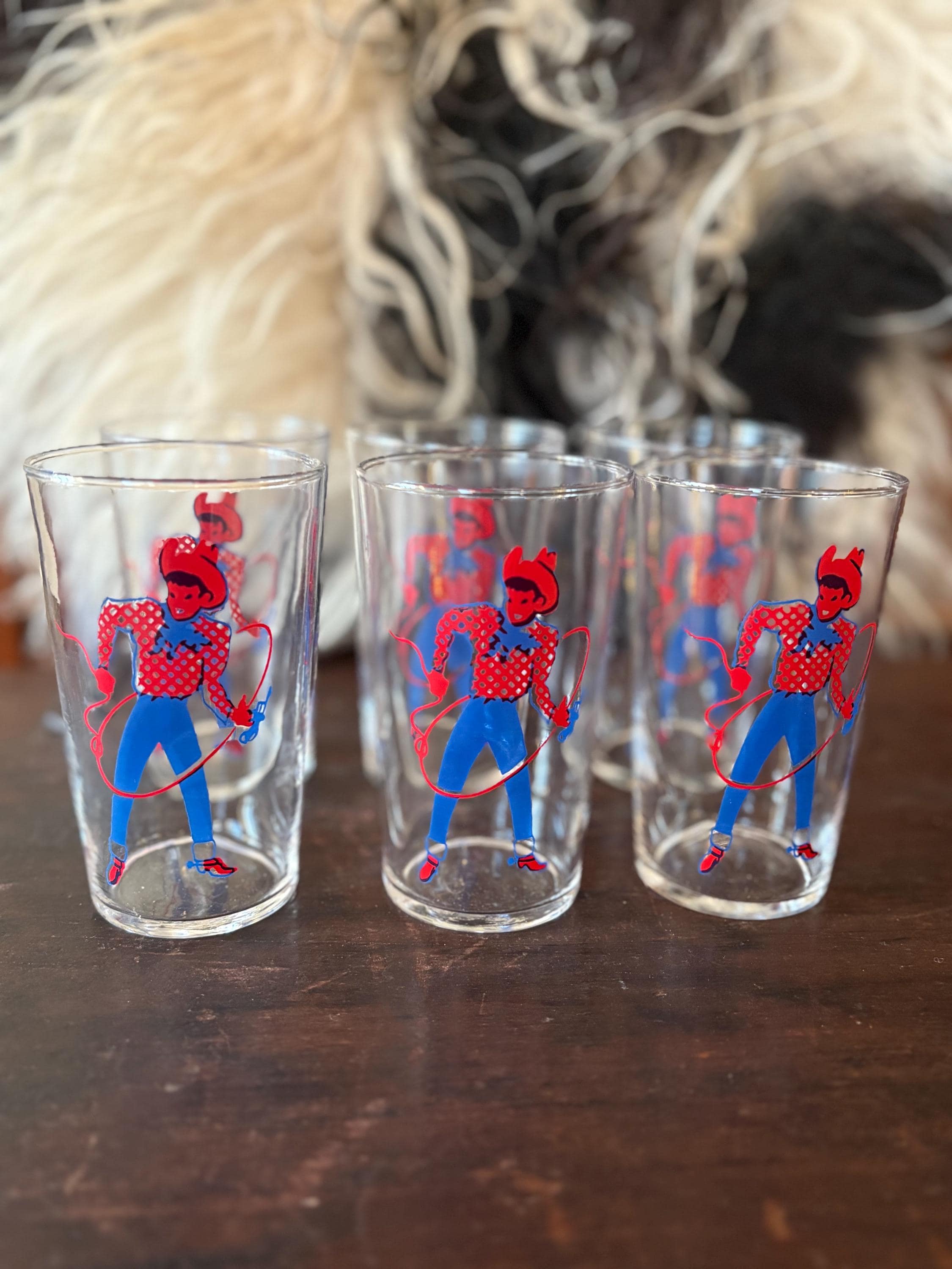 1950s Federal Glass “Dancing Cowboy” Tumblers, Set of 6 w/ Paper Caddy