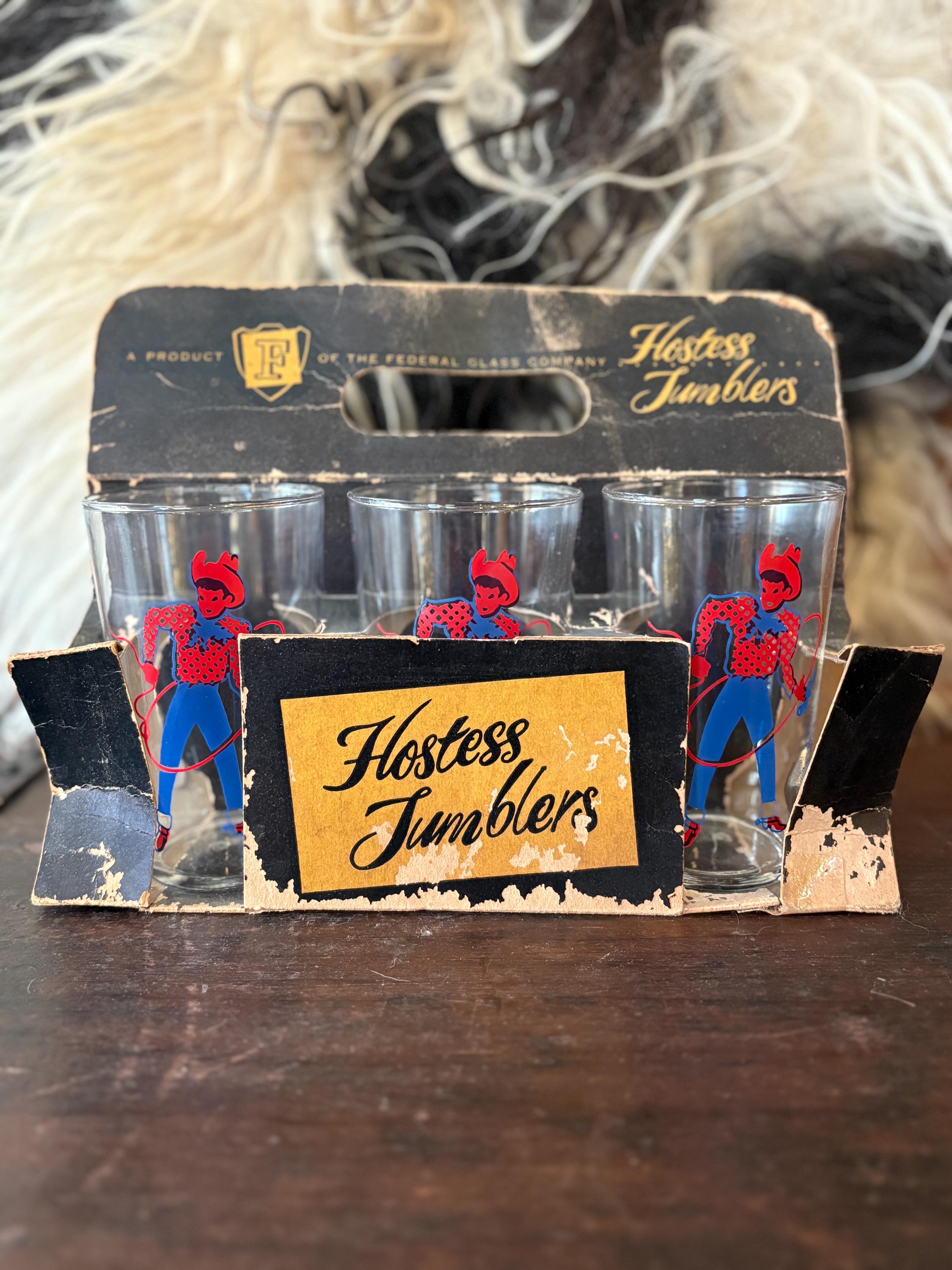 This is a set of 6 collectible “Dancing Cowboy” Hostess Tumblers by Federal Glass. They are all in pristine condition with no scuffs to the printed cowboy designs. The paper caddy is deteriorating as expected with age (1950s) but still in tact, and will ship with the tumblers. This design in particular is hard to come by!