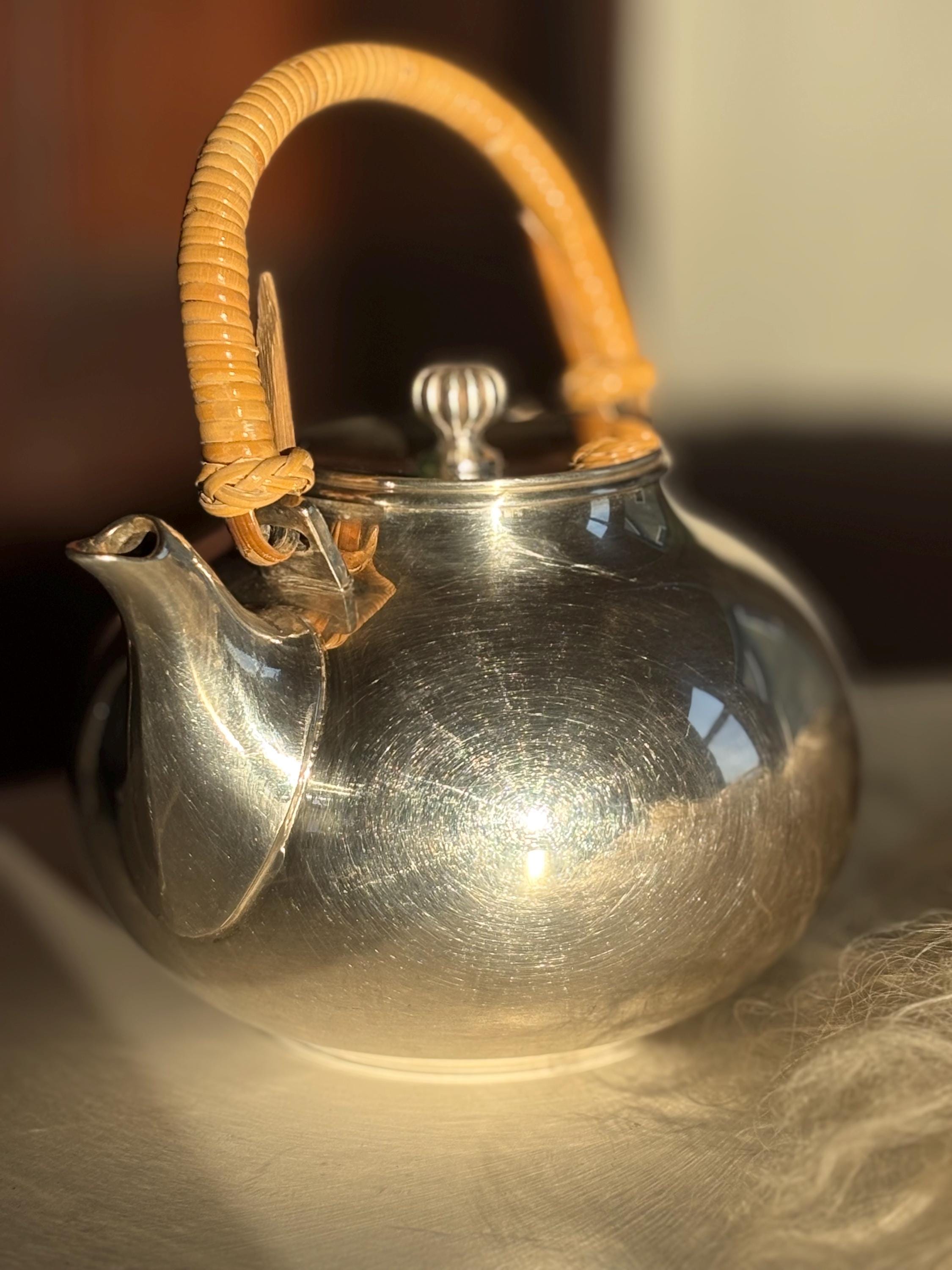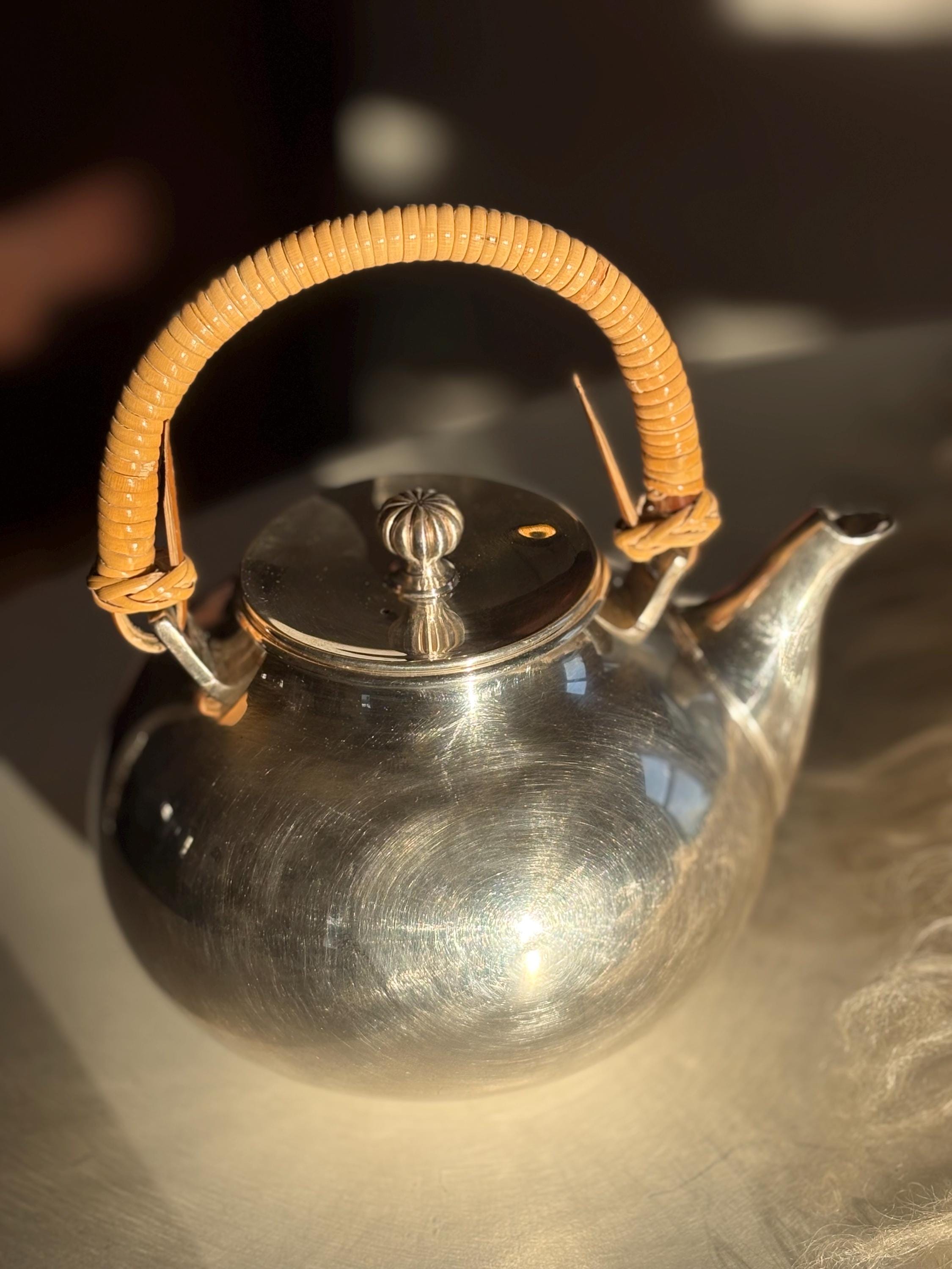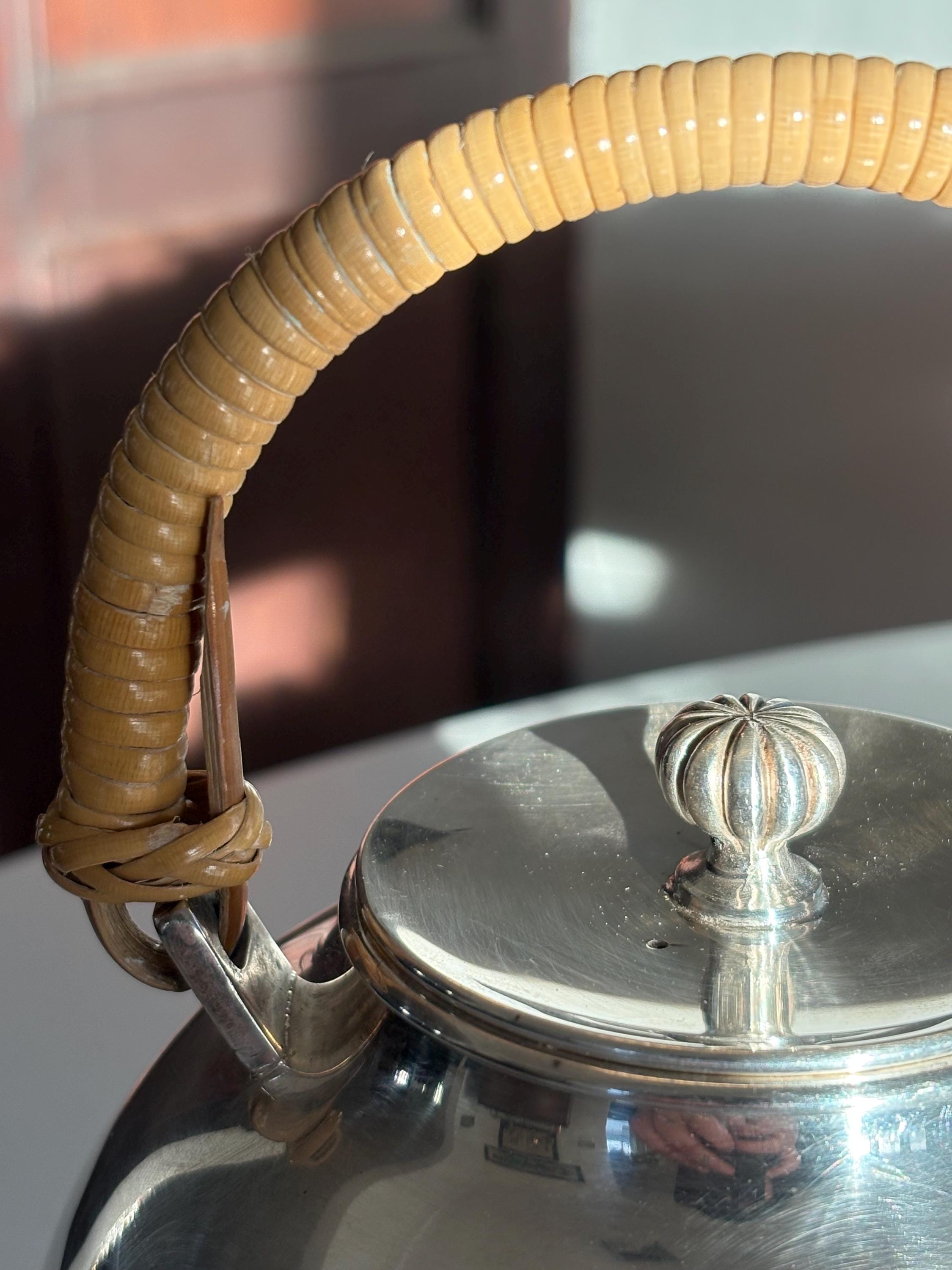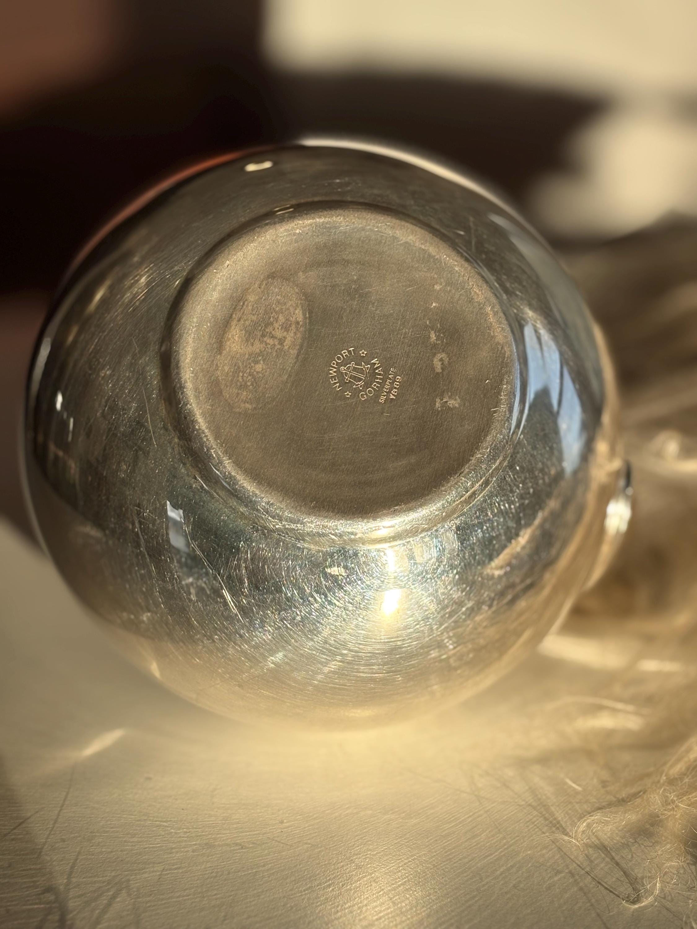 This is a gorgeous Gorham Newport teapot, silver plated with a bamboo wicker handle. There is a very small dent on one side but it is in otherwise great shape for its age. The wicker handle is sturdy and in great shape which is rare to find. Please look over images carefully as they are a part of the description. Likely manufactured in the late 70s. Has a lovely shape and would make a perfect addition to any mid century kitchen!