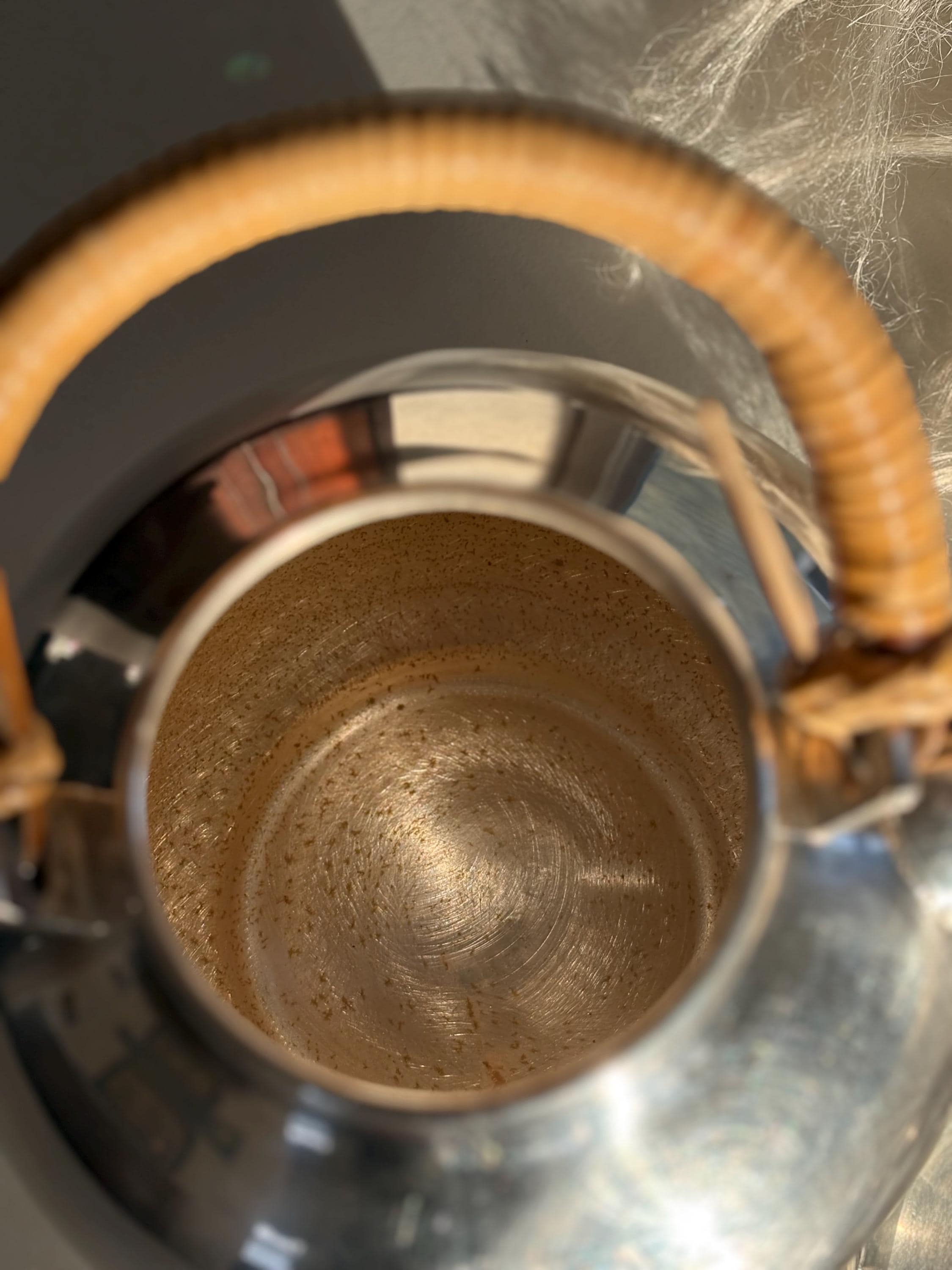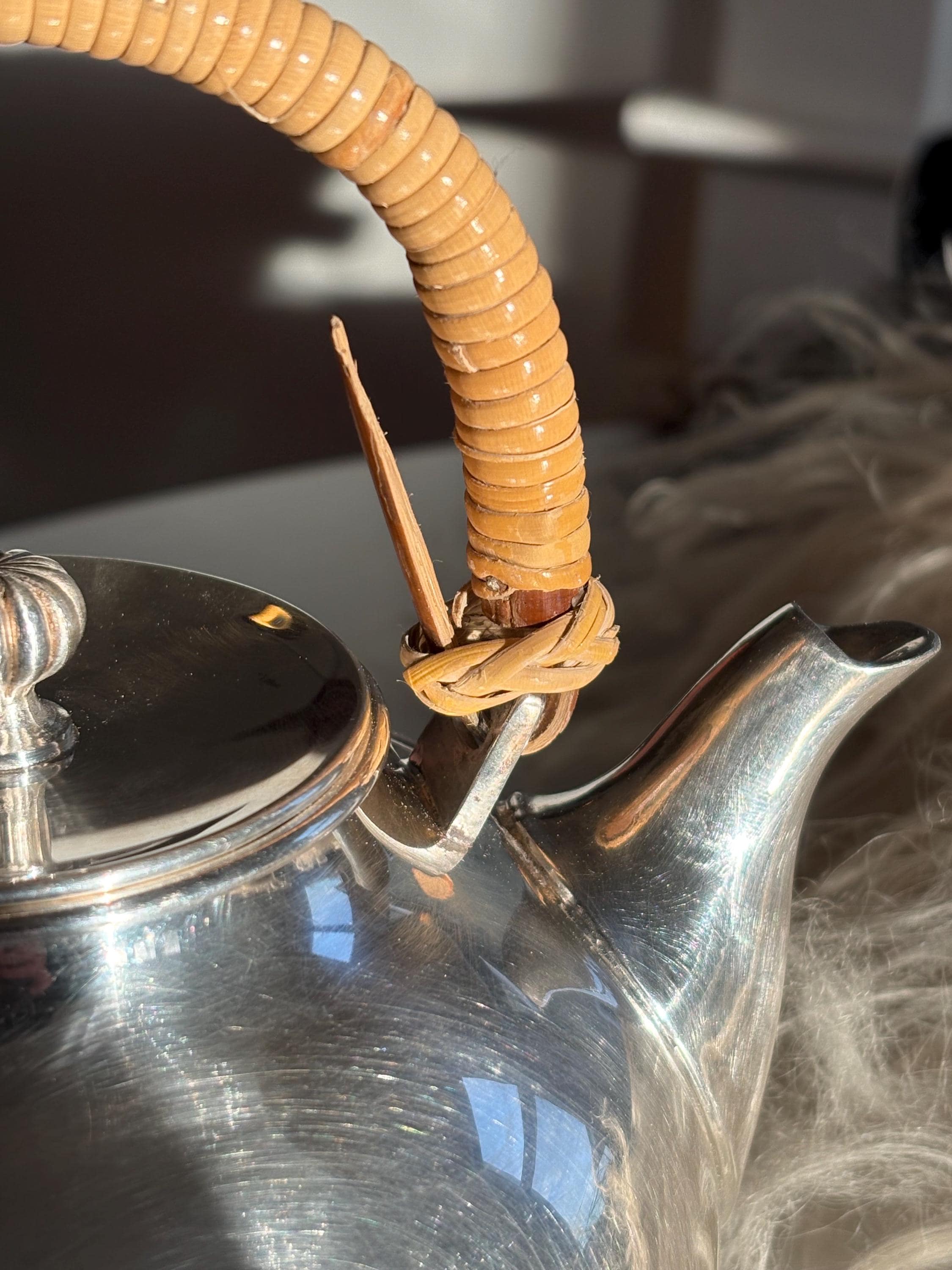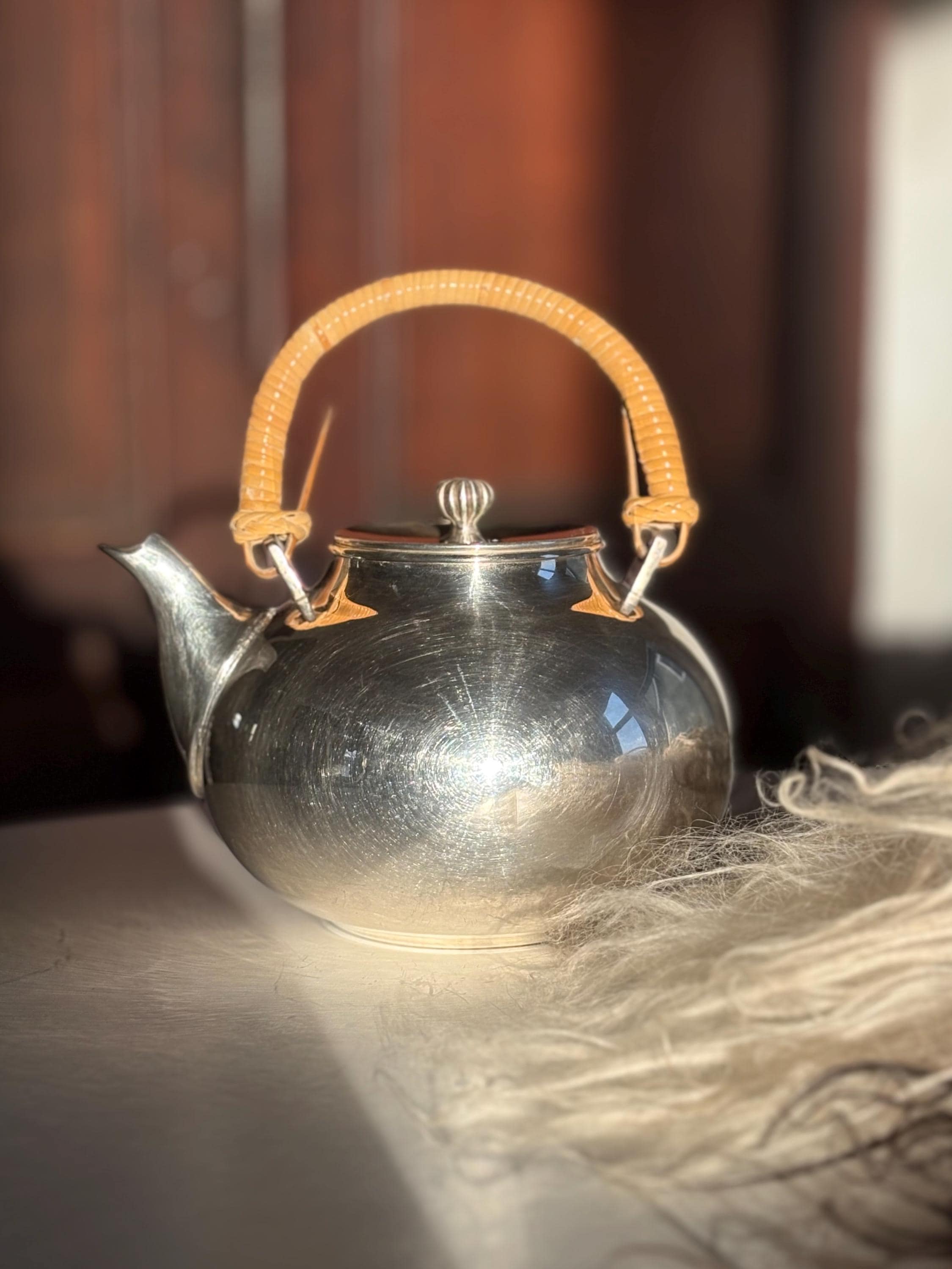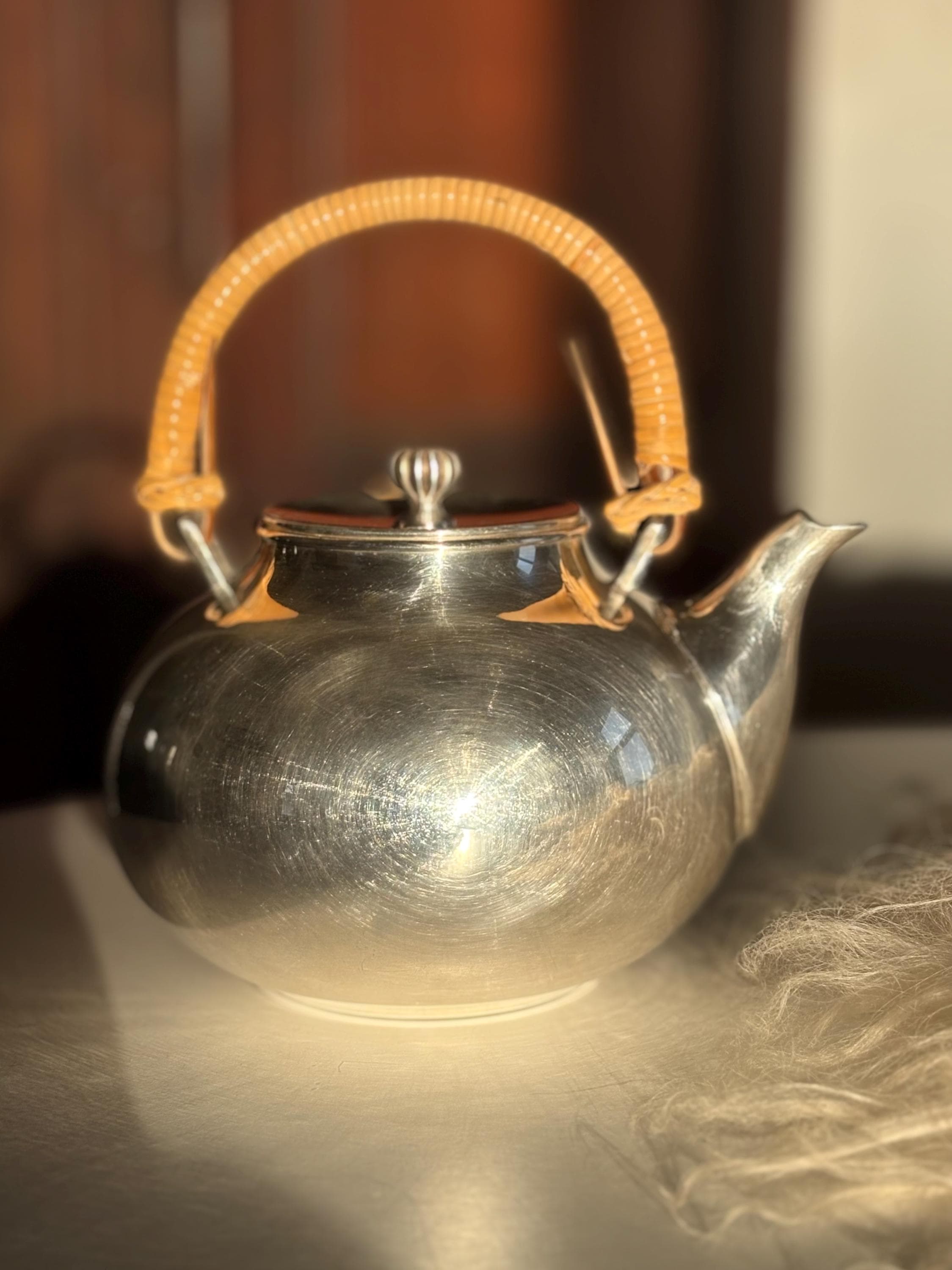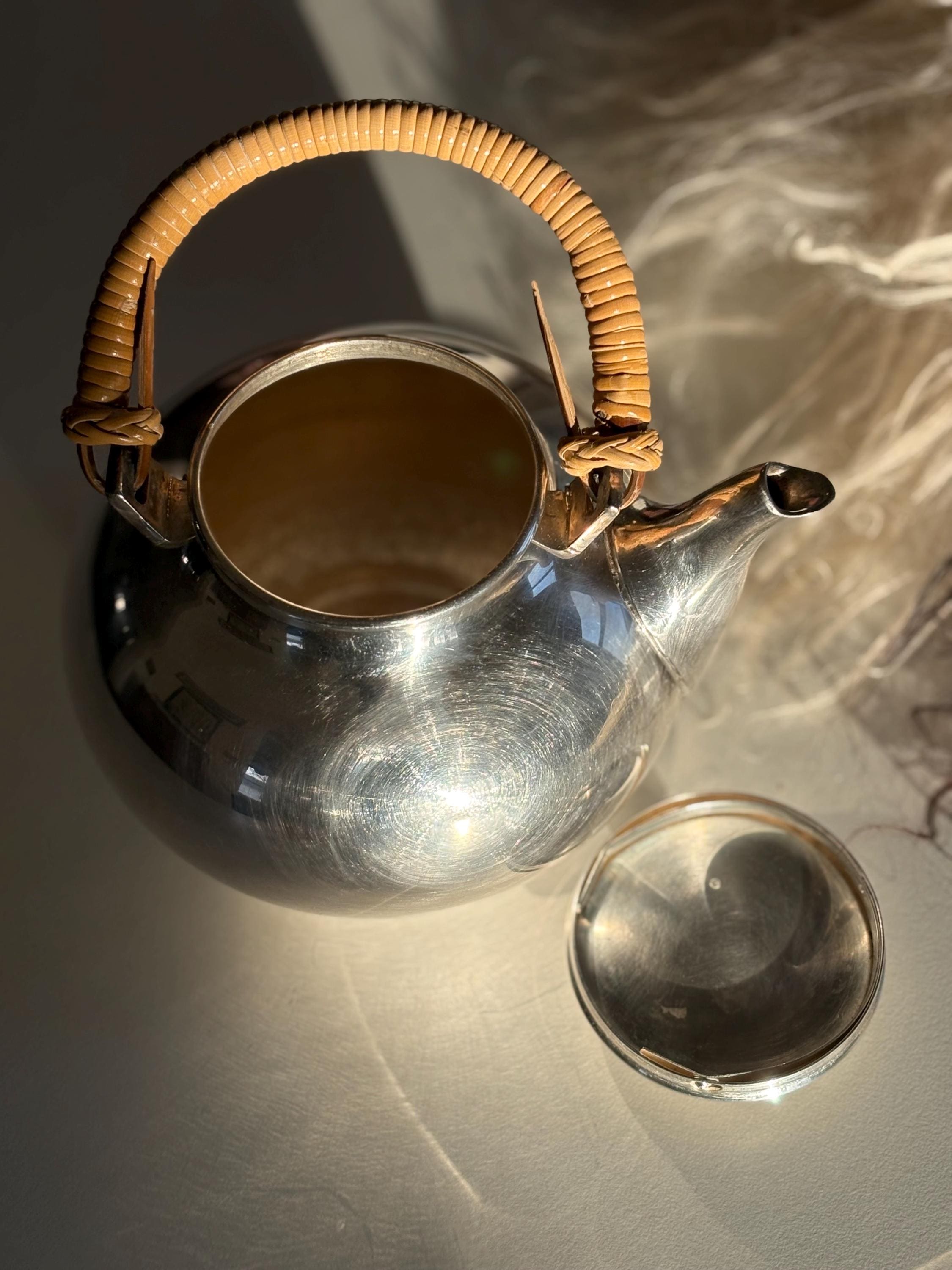 This is a gorgeous Gorham Newport teapot, silver plated with a bamboo wicker handle. There is a very small dent on one side but it is in otherwise great shape for its age. The wicker handle is sturdy and in great shape which is rare to find. Please look over images carefully as they are a part of the description. Likely manufactured in the late 70s. Has a lovely shape and would make a perfect addition to any mid century kitchen!