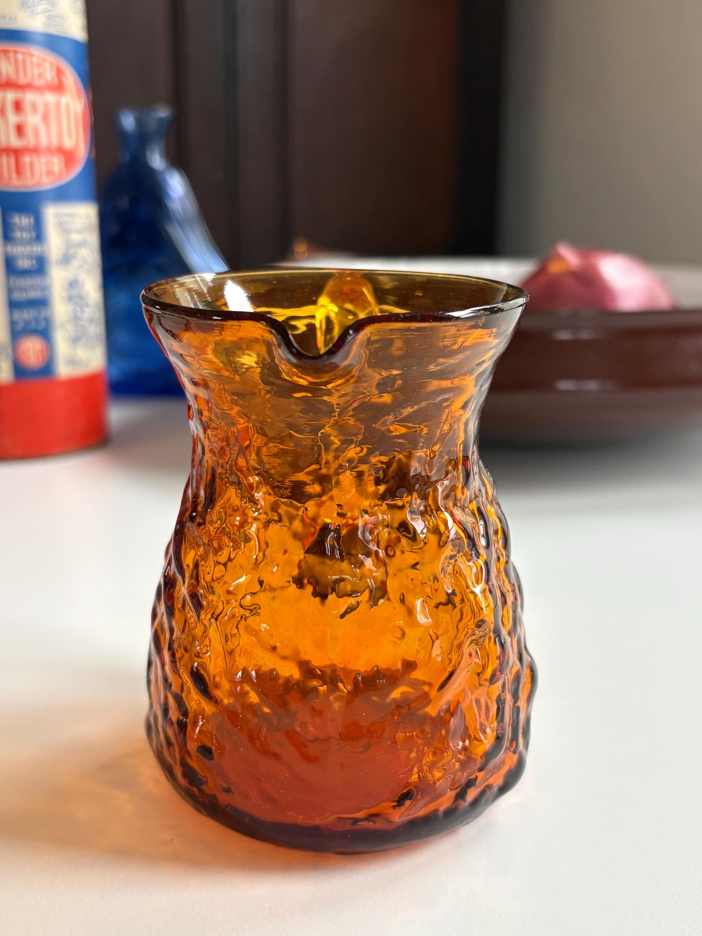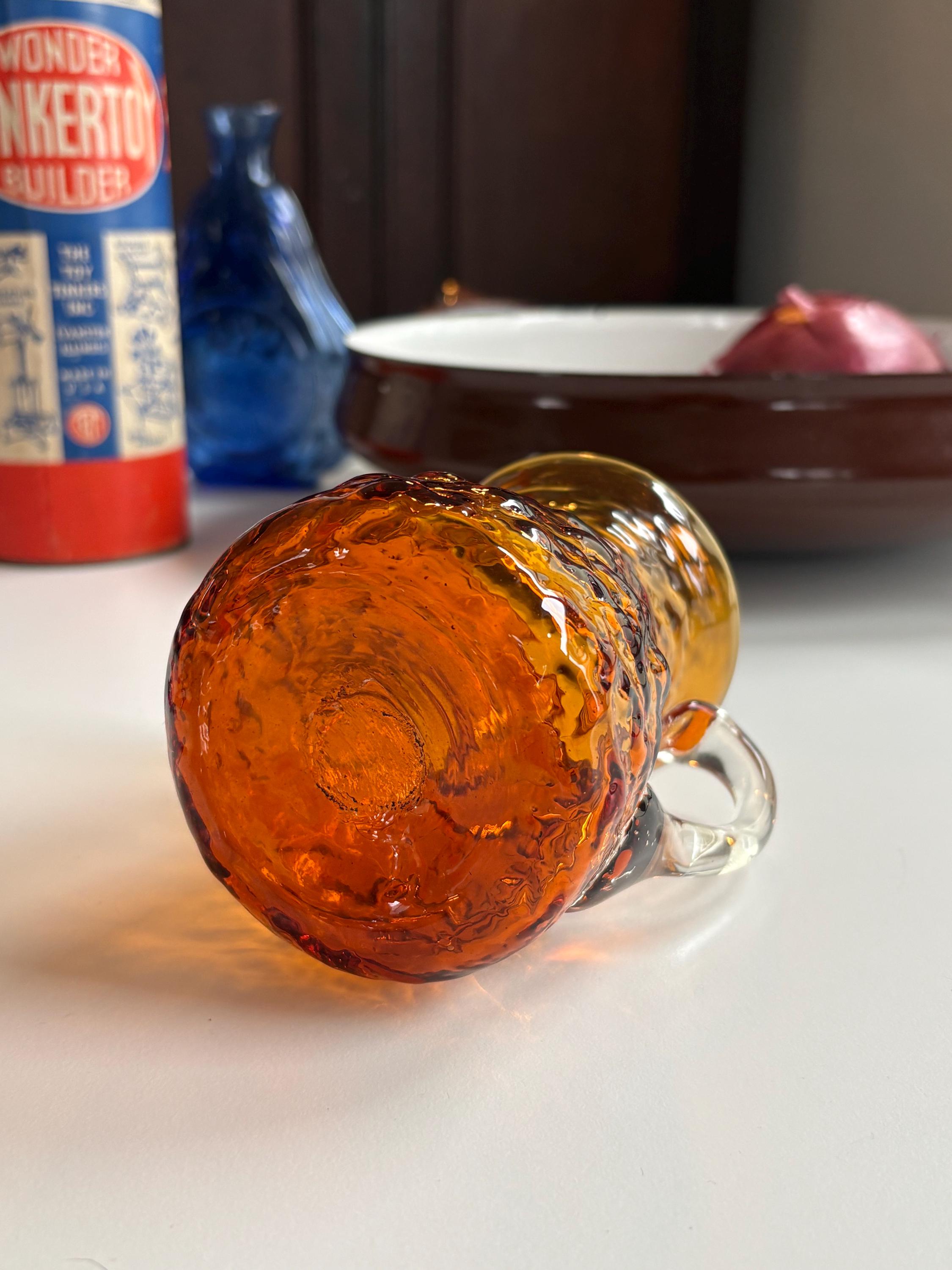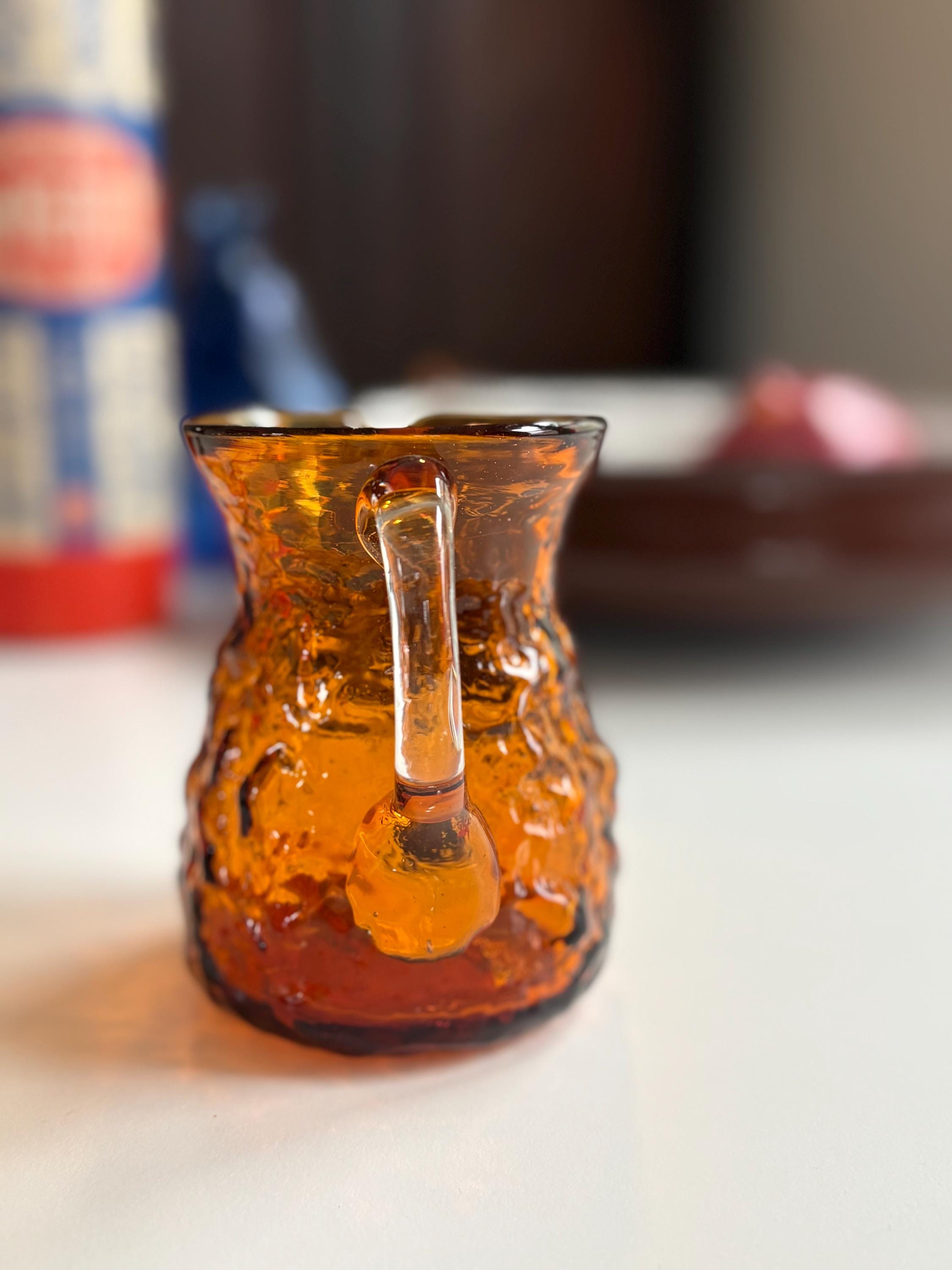 A great mcm piece for the glass collector or simply to use for guests! This creamer is a stunning bright amber orange with a clear glass handle. Very delicately made but sturdy and in great condition. The textured glass has the perfect mcm feel. Stands approx 4” tall and 3” wide at the bottom as well as the opening