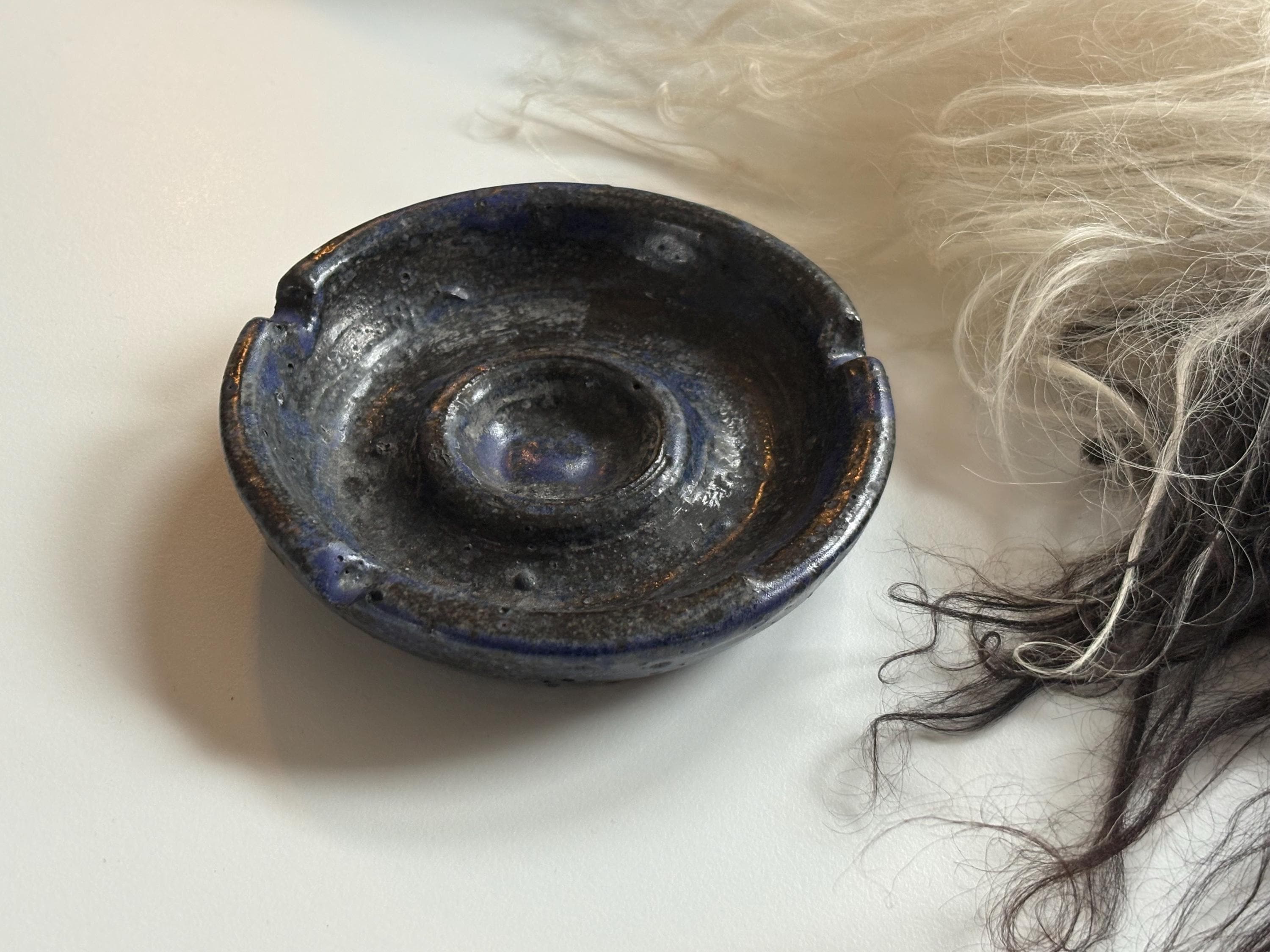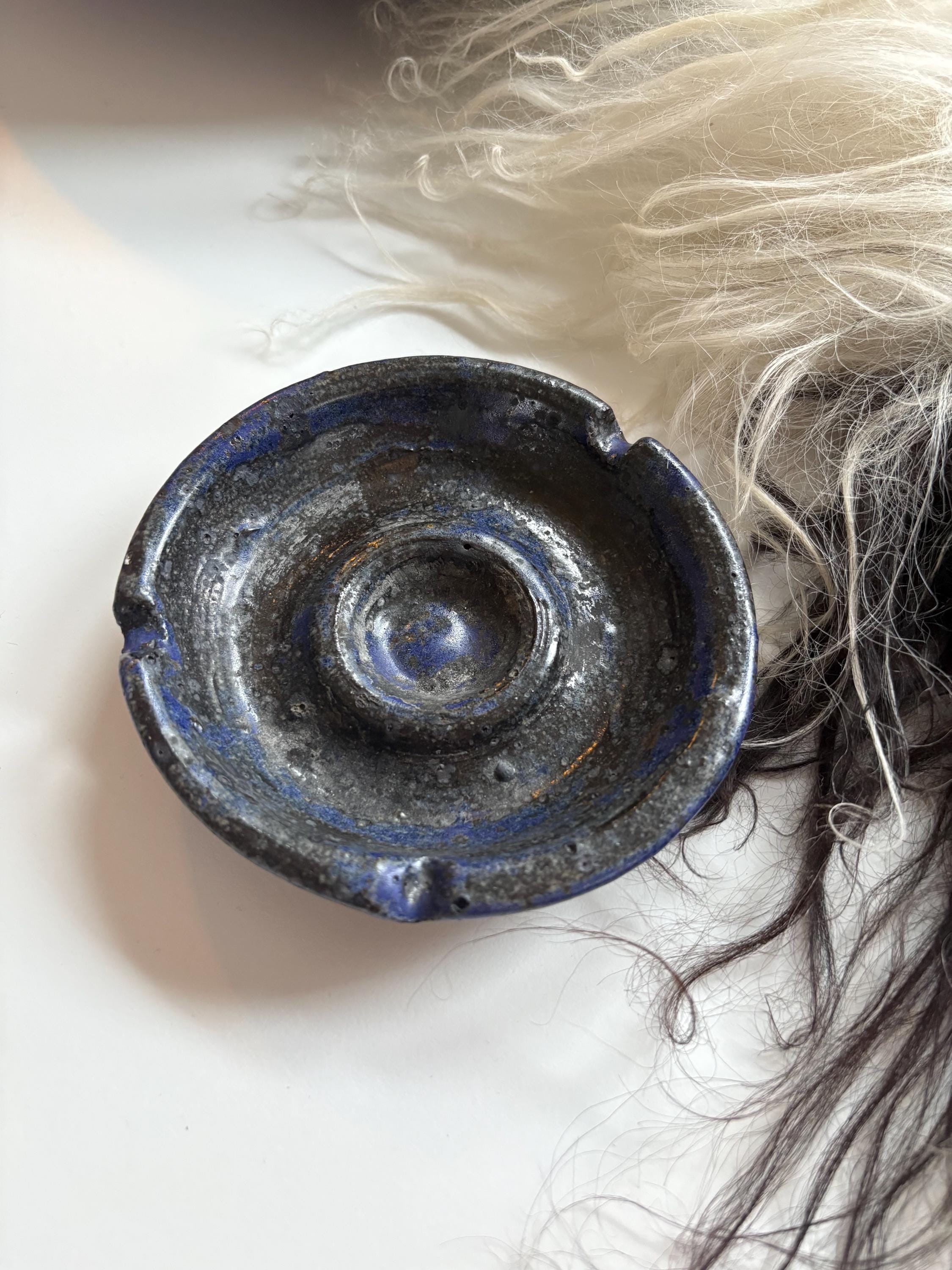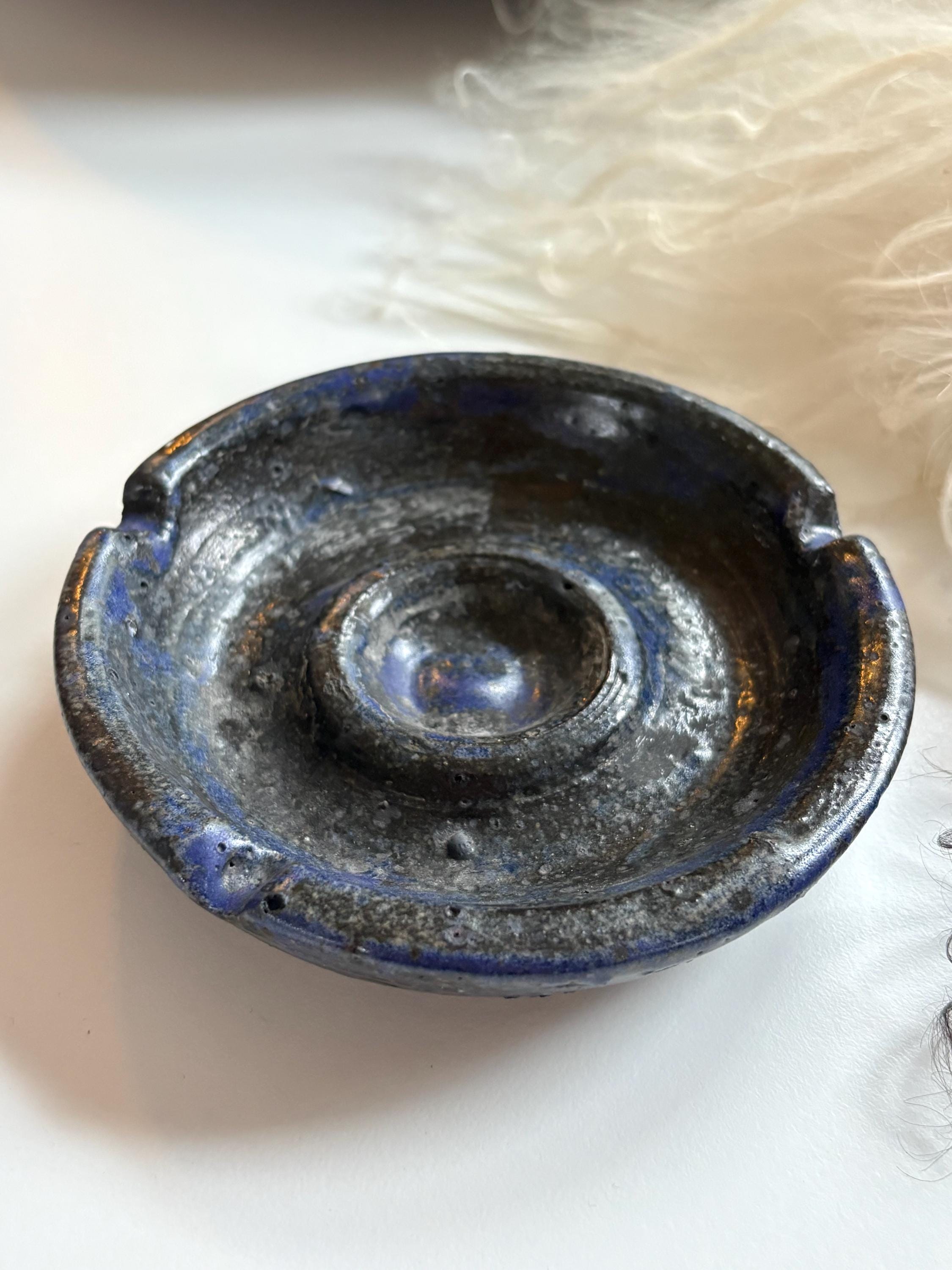 A staple in pottery of the 70s & 80s is lava glaze, especially in a quality ashtray like this one. This ashtray has three slots, handmade and glazed with a lava cobalt blue & black glaze. A great ashtray to break out for company. Signed and dated 1989. Measures approximately 4.5” in diameter.