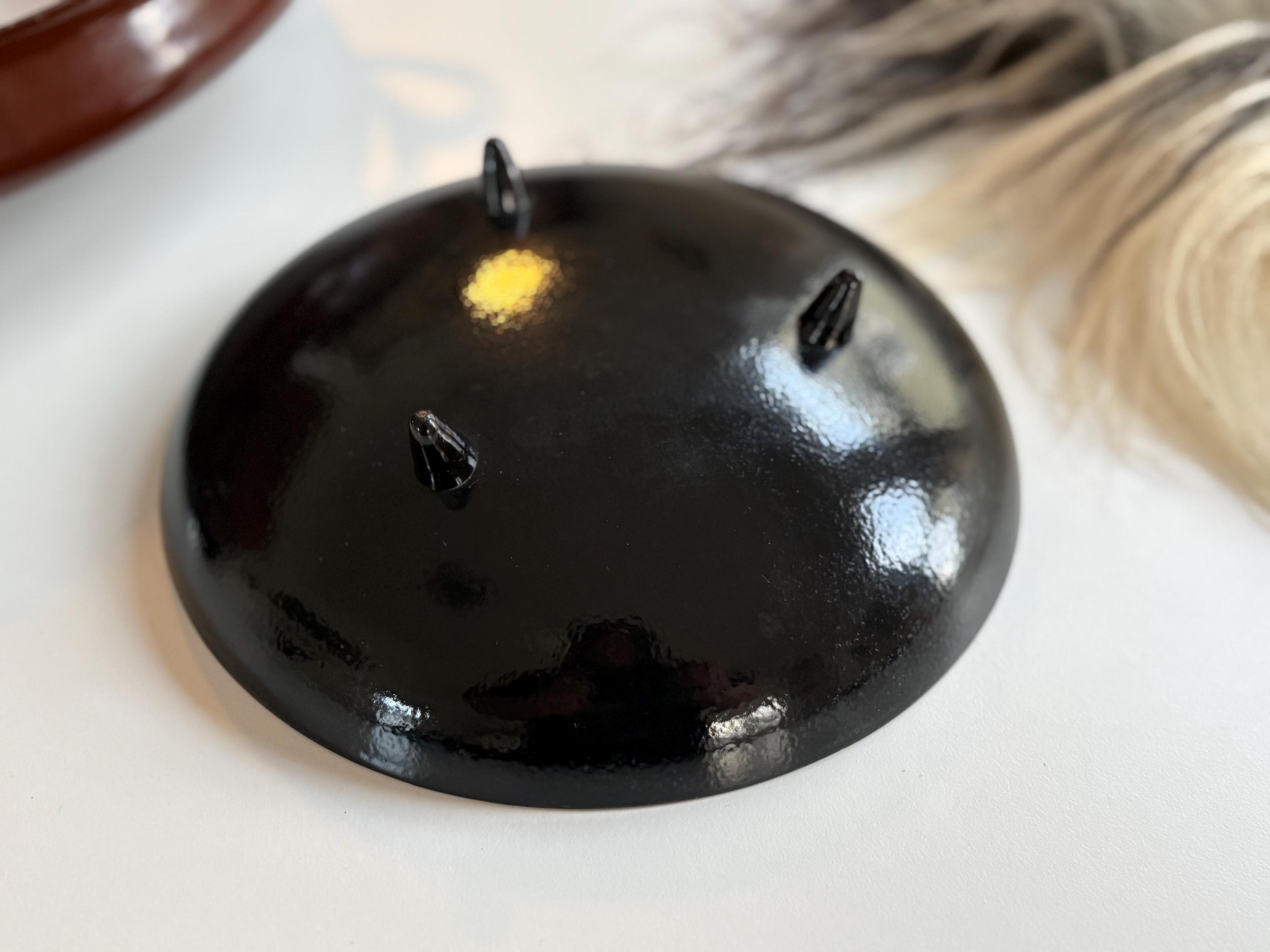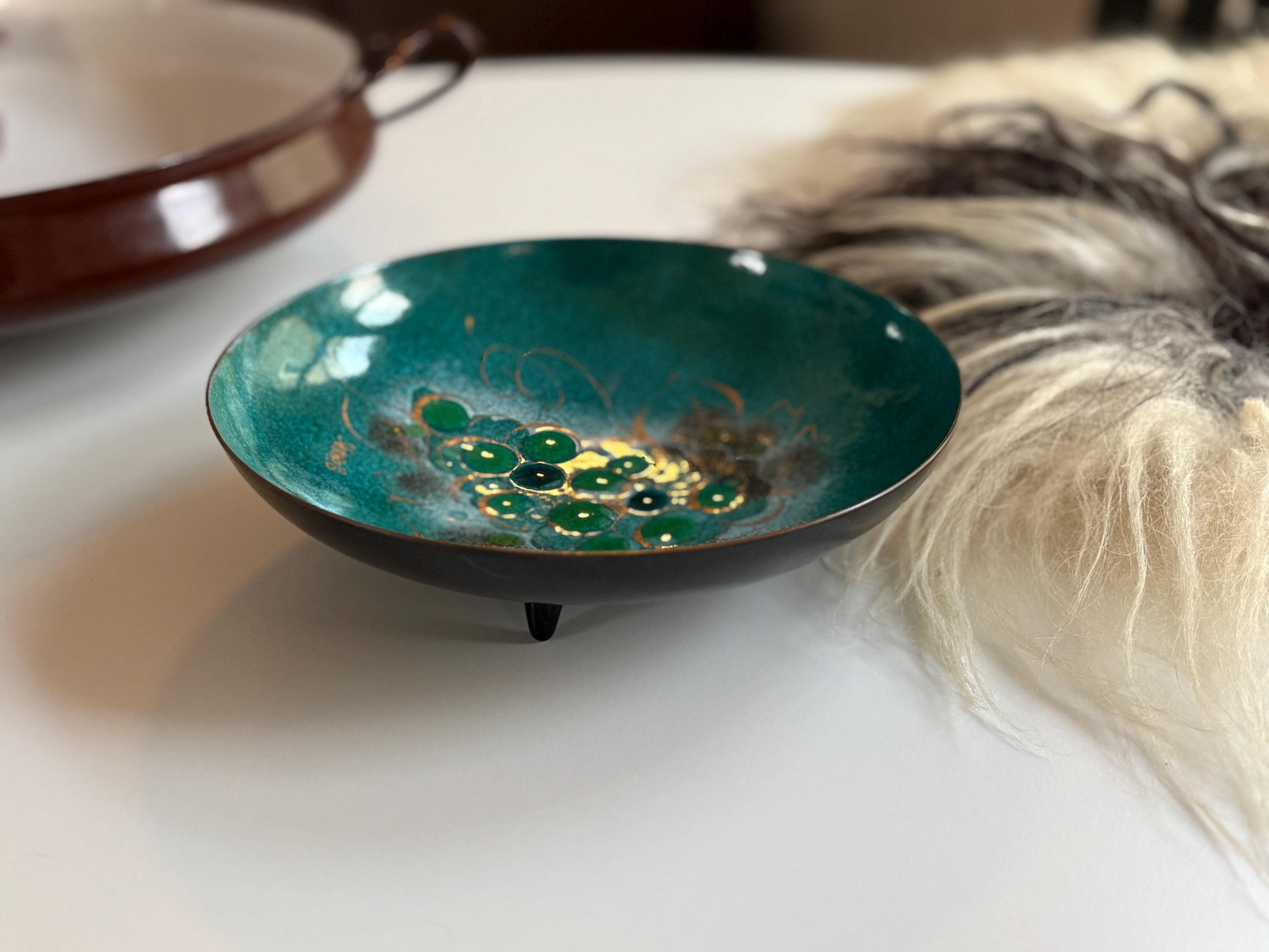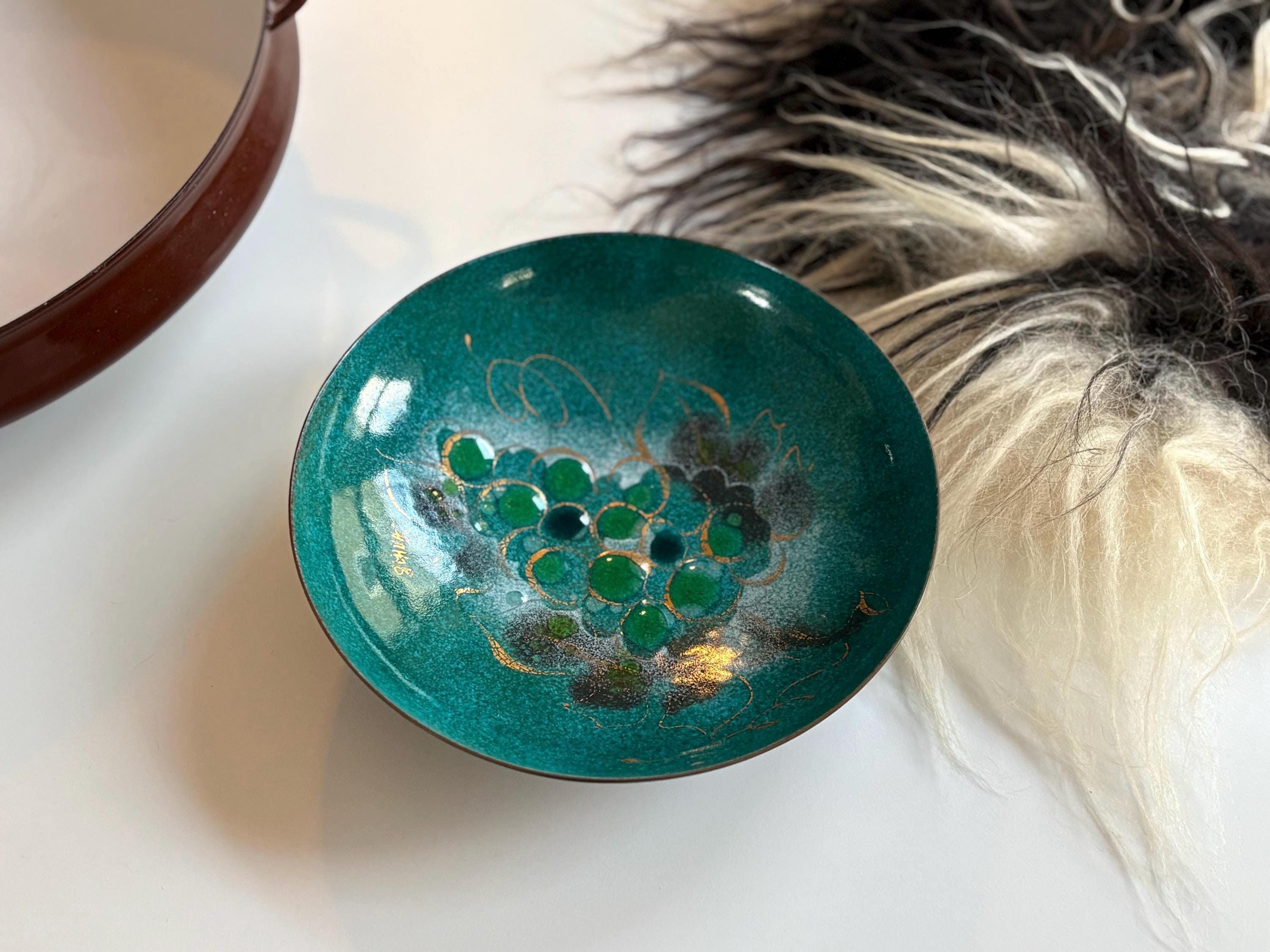 A beautiful 1960s mcm enamled copper bowl by Sascha Brastoff. This bowl is great as a catchall, fruit bowl or simply as a decorative piece in your mid century modern home. It stands on three very atomic looking feet. The inside is adorned with gold and a combination of blue hues with grapes being the prominent feature and the artists signature adjacent. The back is painted a deep black. This bowl is in great condition and measures approximately 8” wide and 2.25” tall.